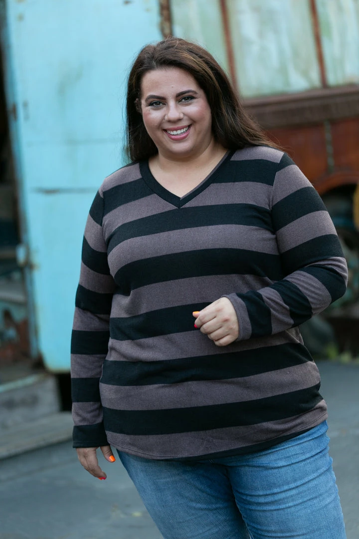 Treat yourself to this amazing striped long sleeve hacci pullover. With a relaxed fit, this top features a v-neck, long sleeves and rounded hem.
