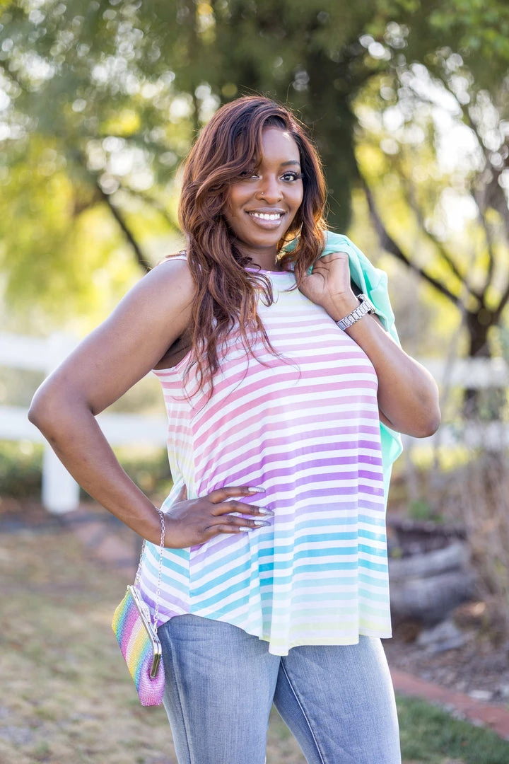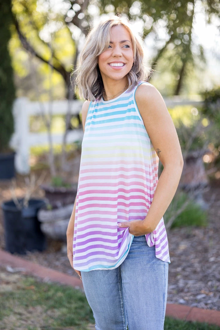Just as sweet as a twisty pop, this rainbow striped gradient top will complete your life. Made from bulgari fabric, this sleeveless top features a round neckline and rounded hem.