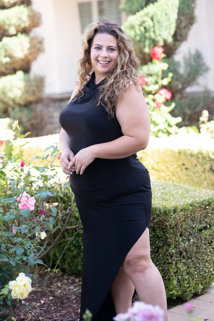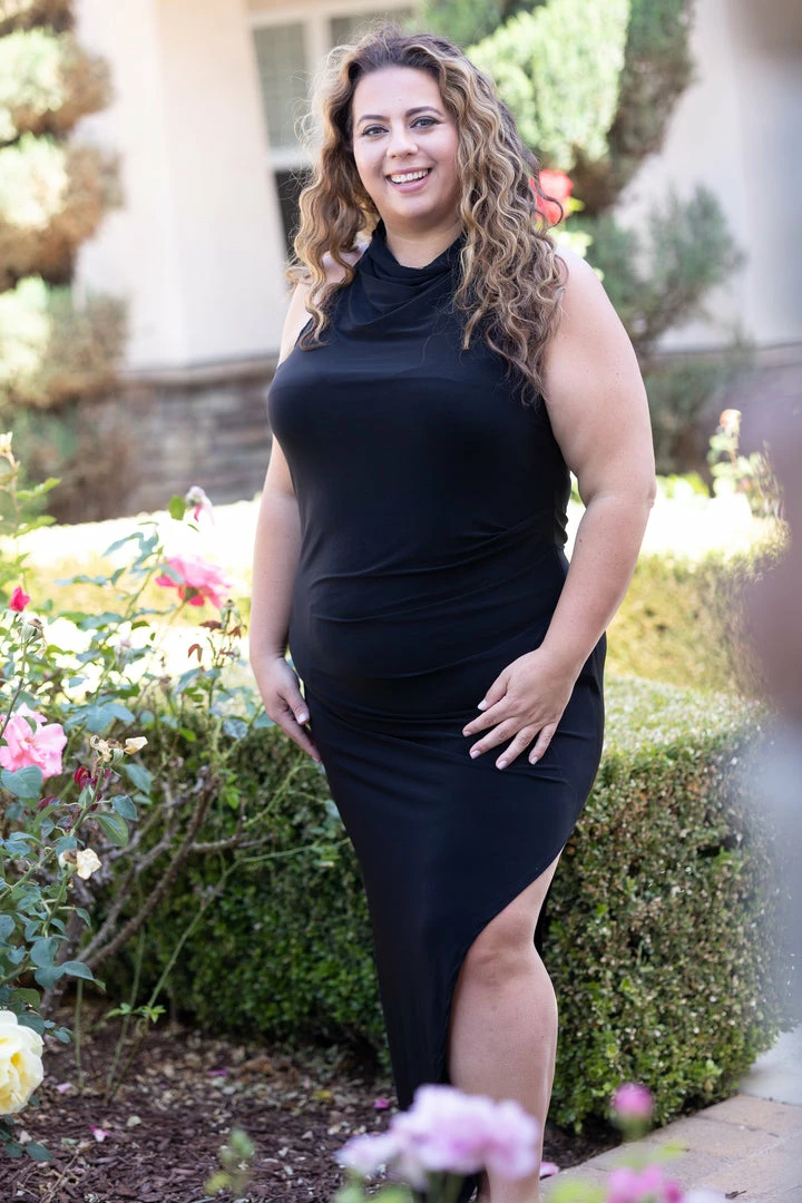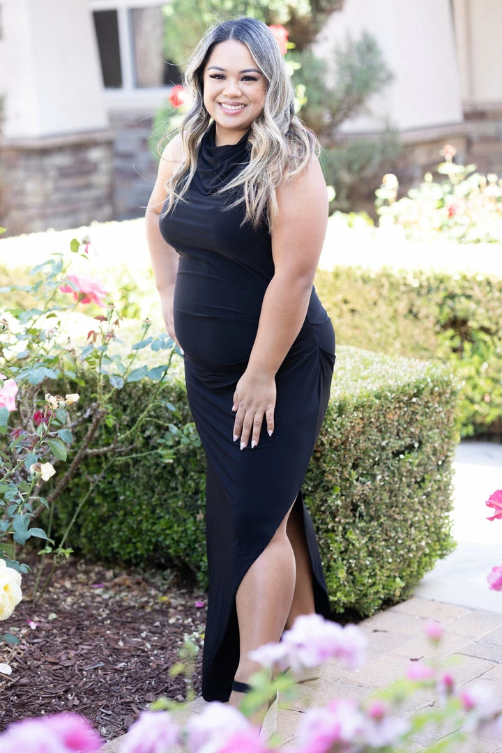 This elegant and sleek black maxi is perfect for those days/evenings that you want to get dressed up. With a semi fitted silhouette, this dress features a gathered mock neck, open back, ruched sides and side slit.