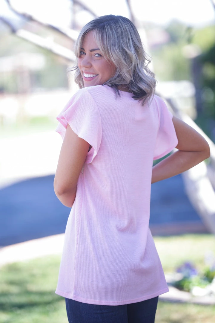 This short sleeve laced flutter sleeve is truly a vision of love. Made from a micro waffle knit, this top features a relaxed fit, v-neck and rounded hem.