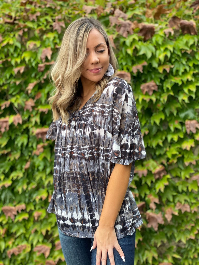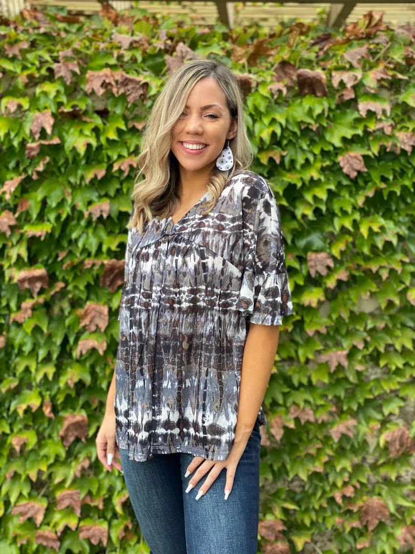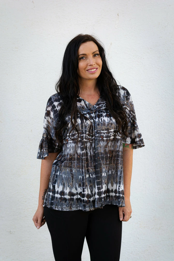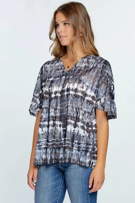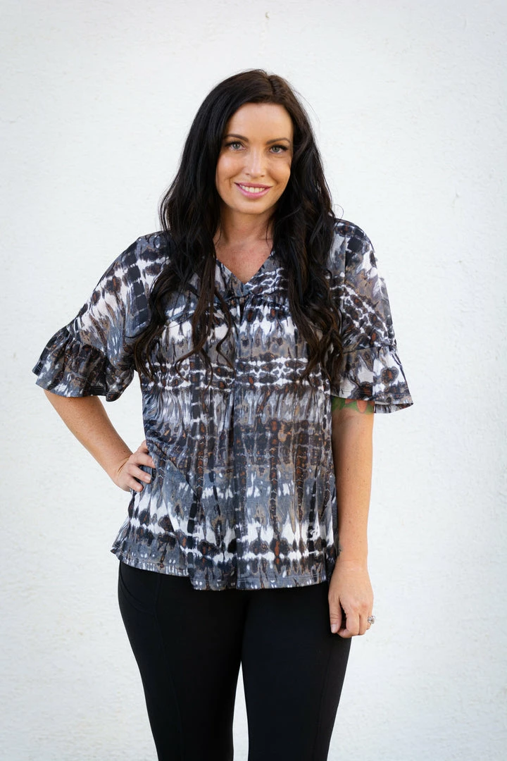 There are no limits to where you can go in this short sleeve loose fit top. Featuring a v-neck and ruffled sleeves .