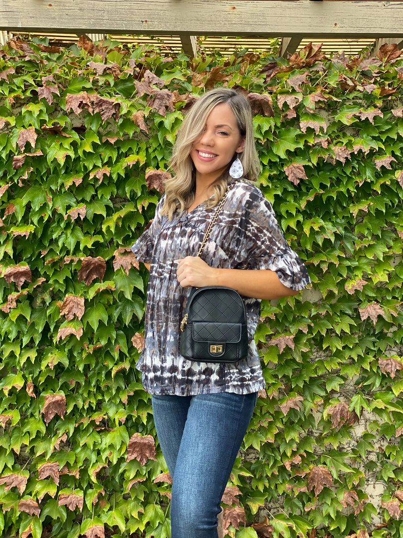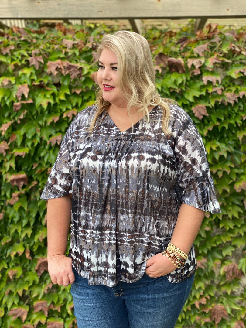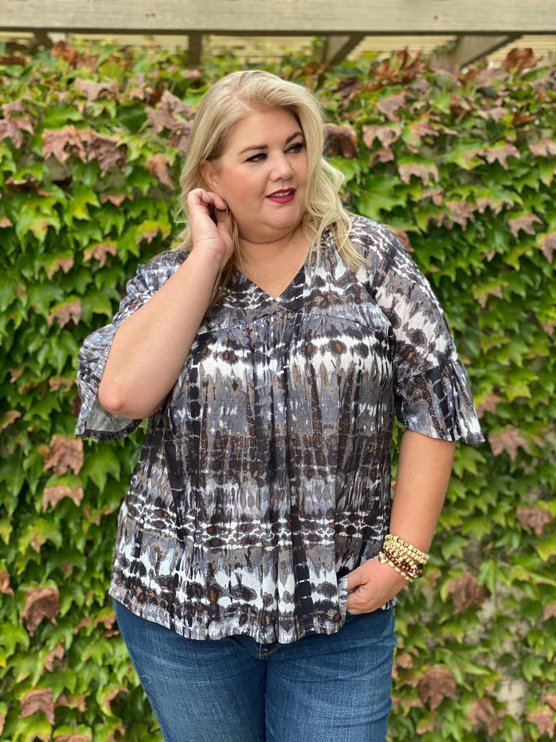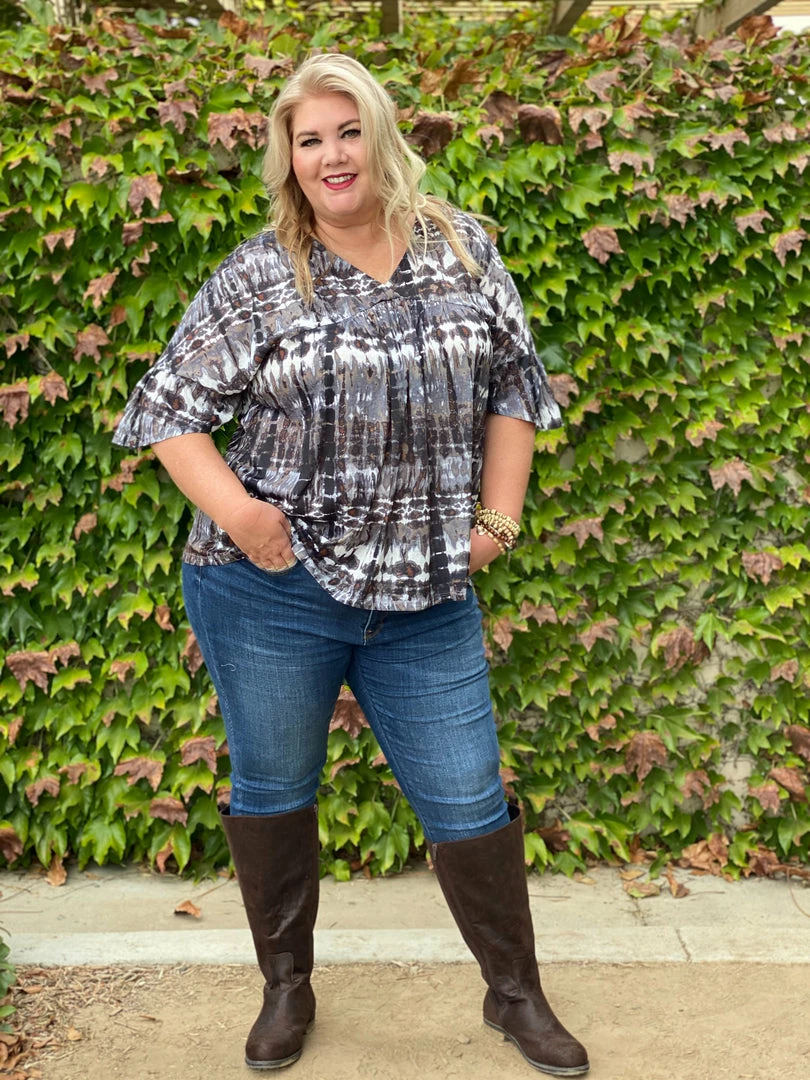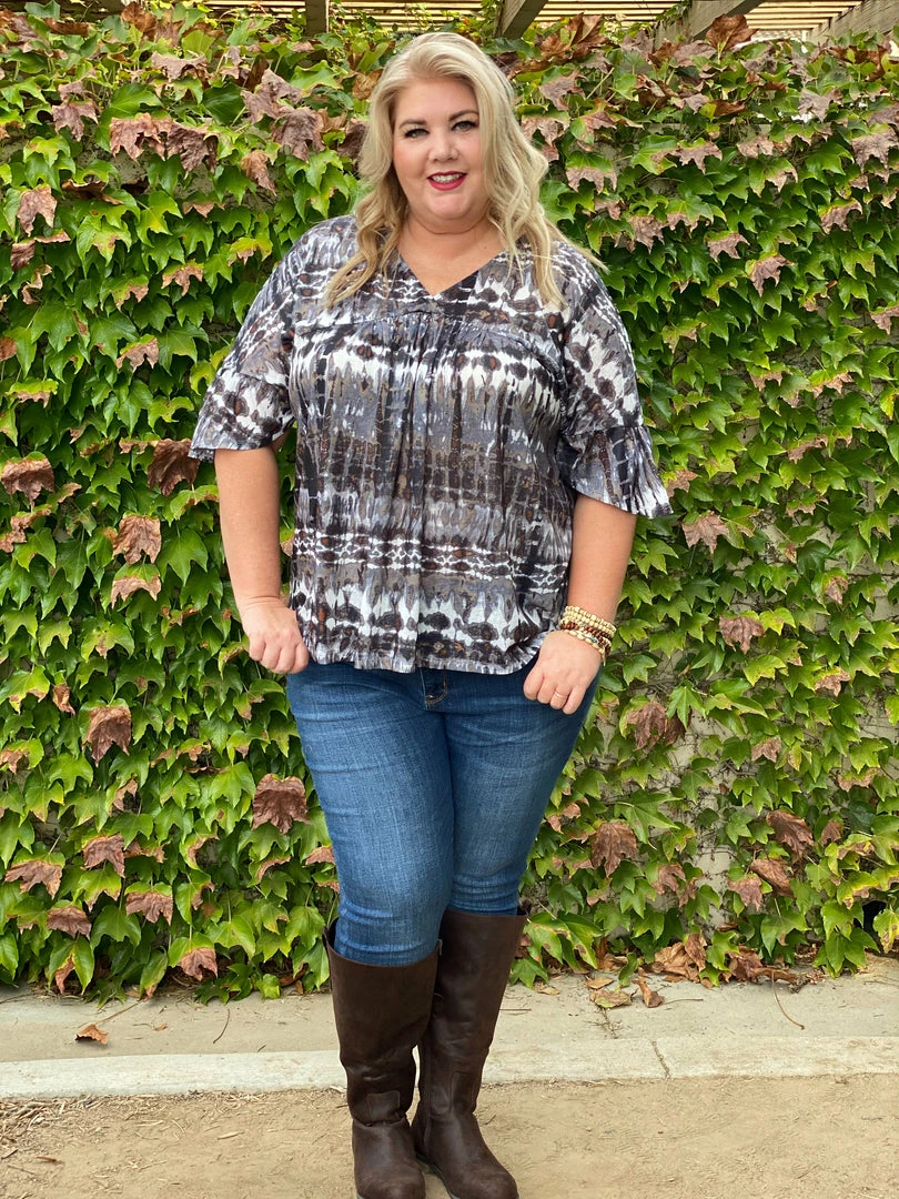 There are no limits to where you can go in this short sleeve loose fit top. Featuring a v-neck and ruffled sleeves .