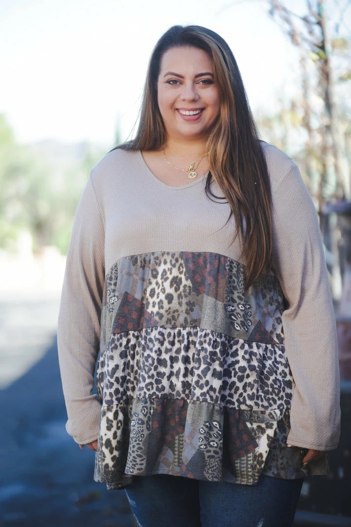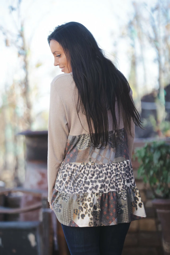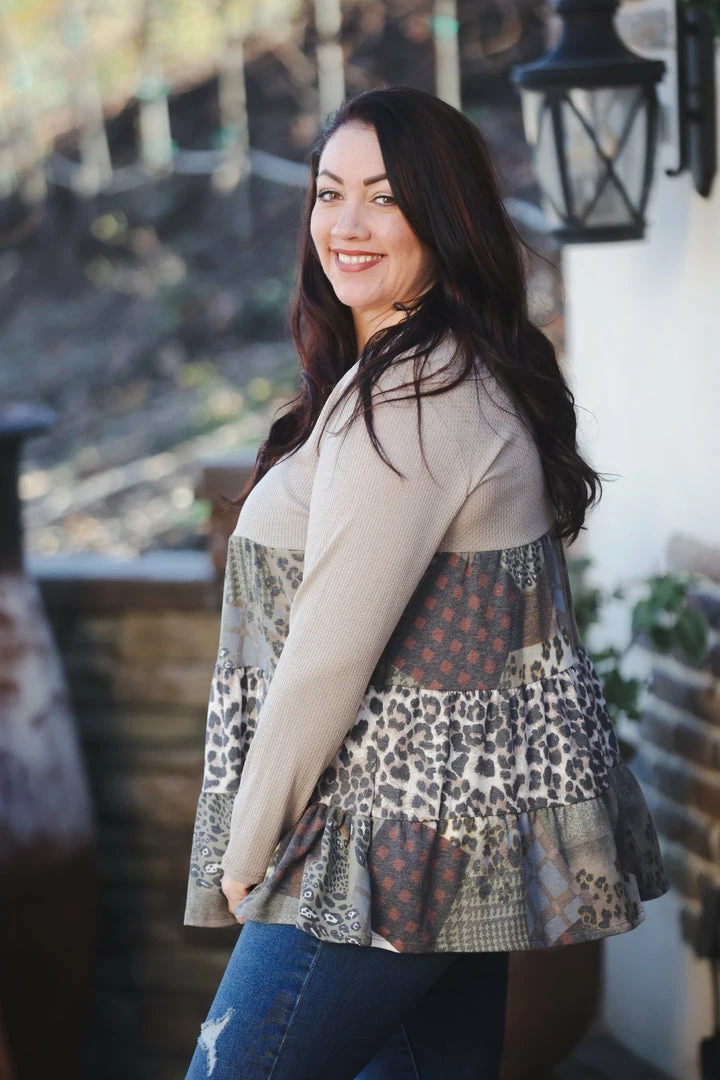 We are just wild about this waffle knit tiered ruffle tunic. The ruffled tiered hem has the most amazing patchwork combined with animal print making it SO easy to pair with just about everything. With a relaxed fit, this top features log sleeves, a v-neck and ruffled tiered colorblock hem. Â