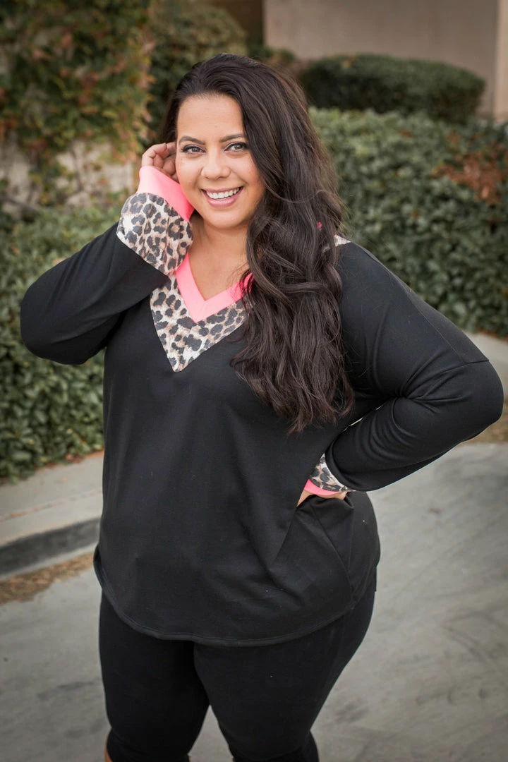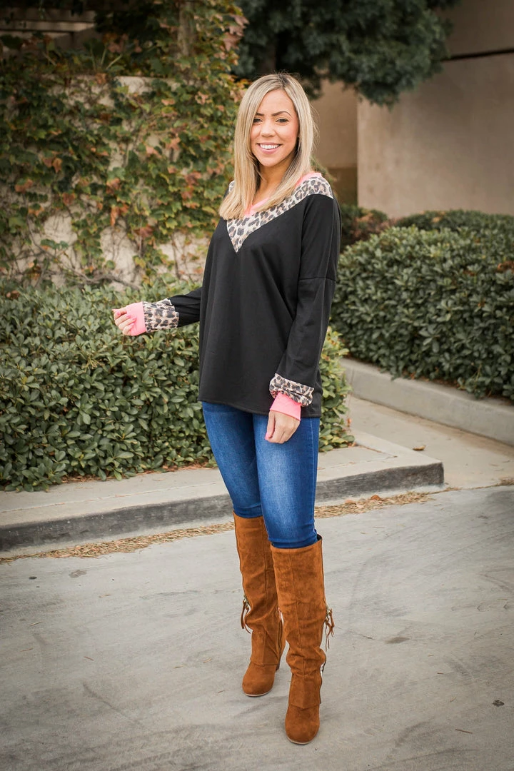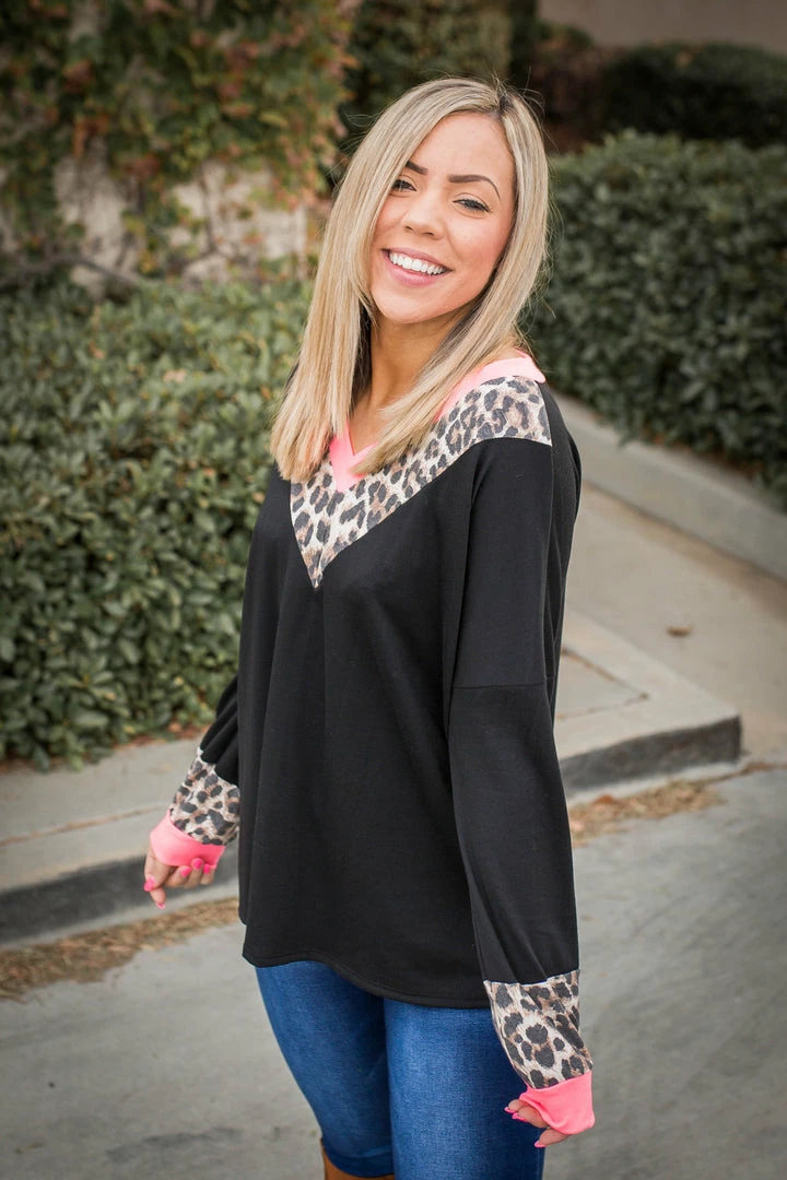 This amazing long sleeve pullover is perfect for all occasions. Featuring a v-neck, with and long sleeves with contrasting pink and animal print.