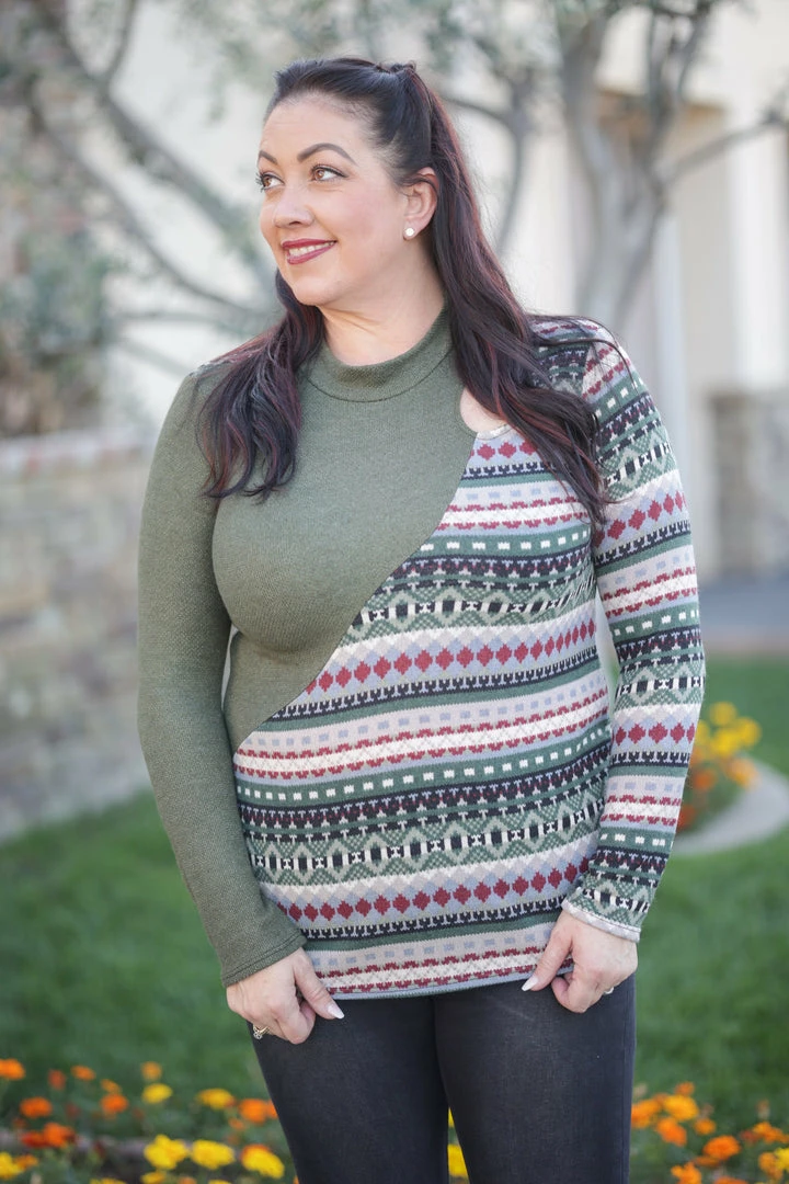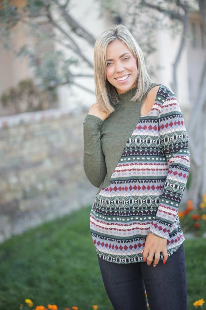 This amazing colorblock top is the perfect blend of aztec and nordic…making it perfect for the winter season. Made from a hacci knit, this top features a mock neck, long sleeves, rounded hem and shoulder cutout.