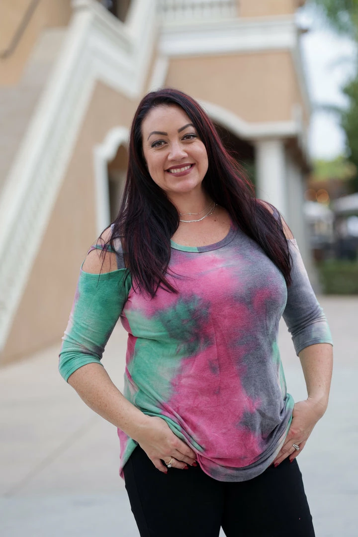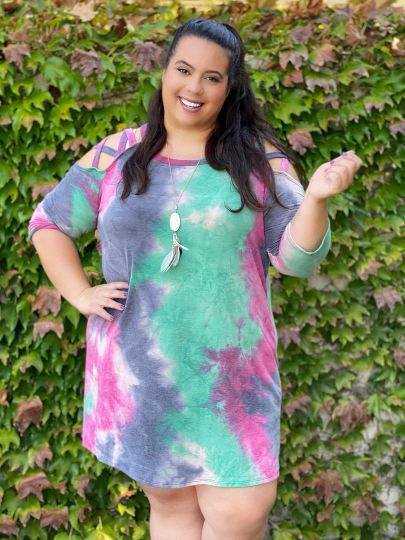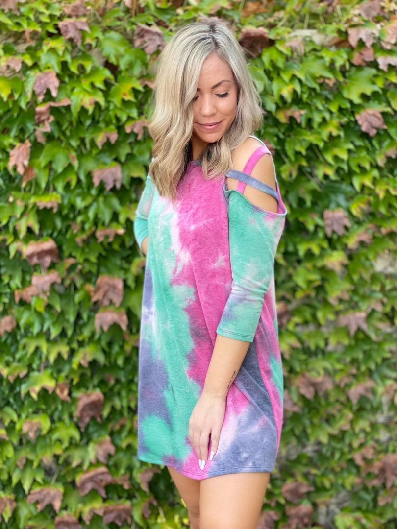 This tie dye cold shoulder dress is perfect for fall. The strappy cold shoulders really give this piece a unique a look. With a relaxed fit and 3/4 sleeves, this dress will look amazing with boots.