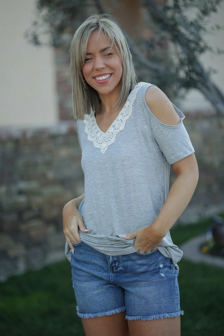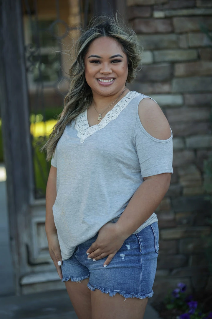 This exquisite lacy cold shoulder is the perfect piece for any occasion, it’s so easy to dress up or down! With a relaxed fit, this top features a v-neck with lace trim, short sleeves with cold shoulder cut outs and a rounded hem.