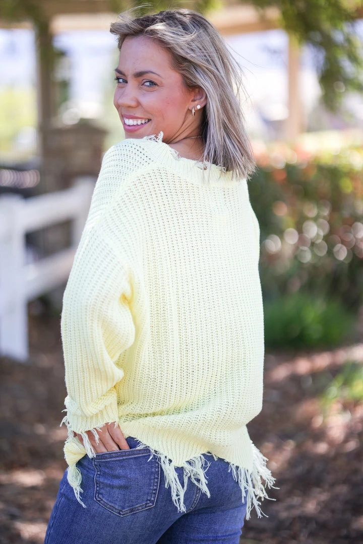 This stunning yellow v-neck sweater is going to become your next favorite and fill you will so much joy! Featuring a frayed hem, this sweater has an amazing relaxed fit and is SO soft!