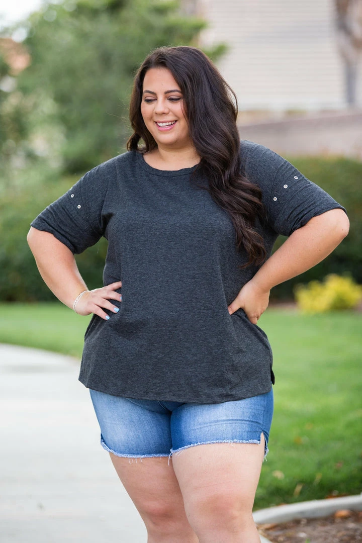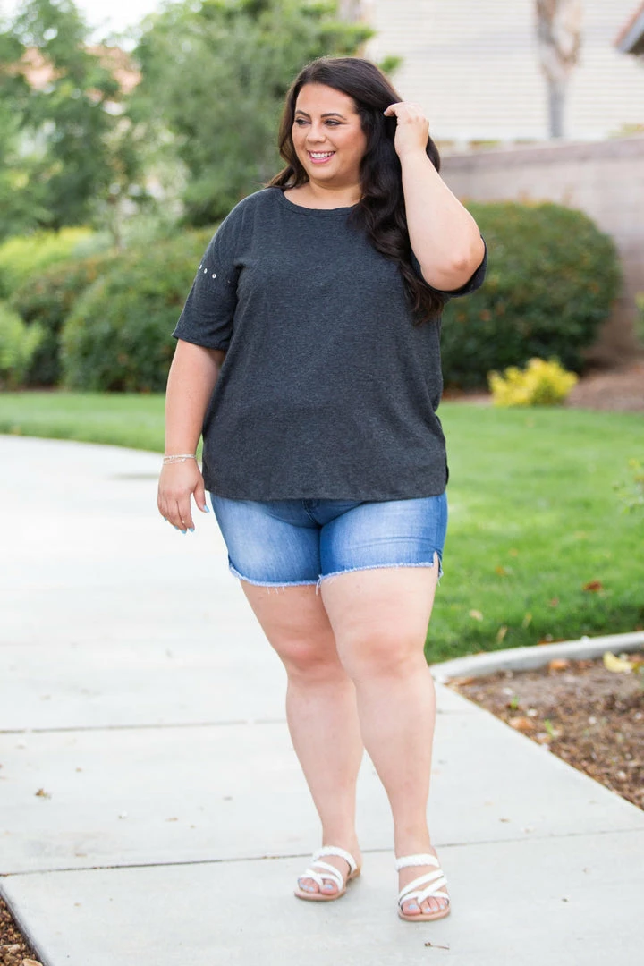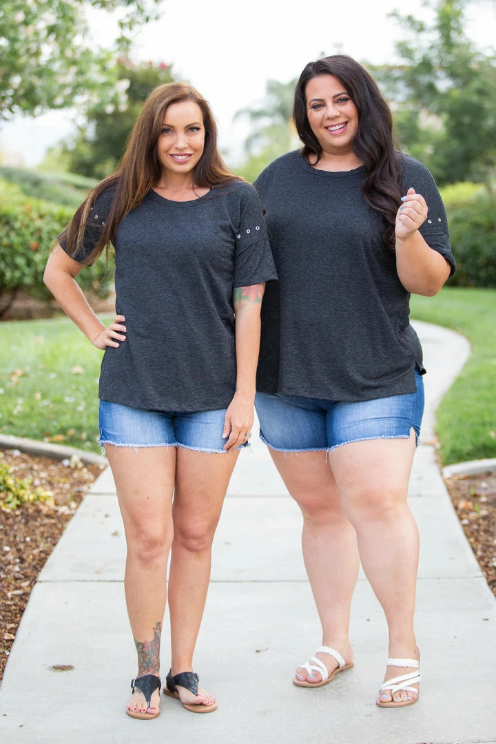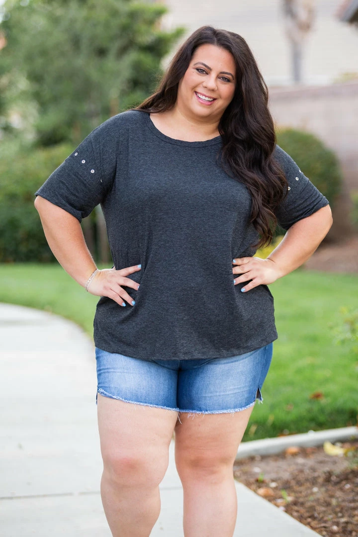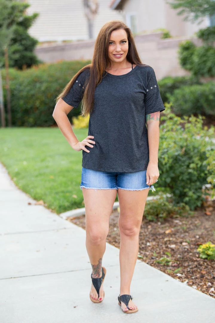 Let your uniqueness shine with this amazing short sleeve top. The eyelet accents on the sleeves really make this piece on of a kind. With a relaxed fit, this top features a round neckline and short sleeves.