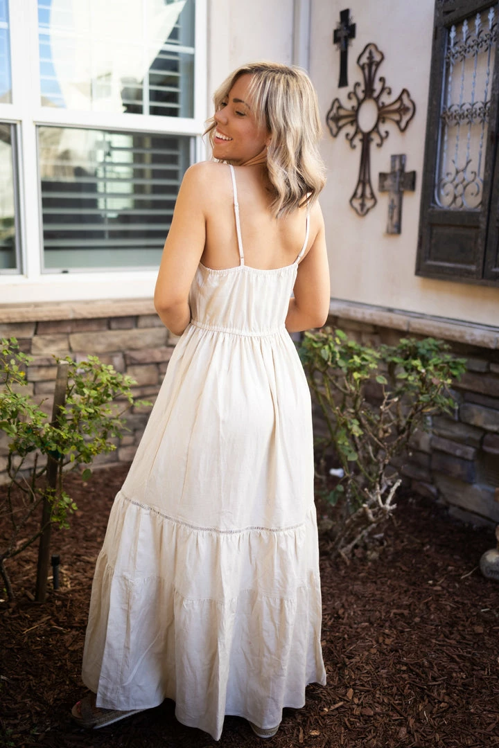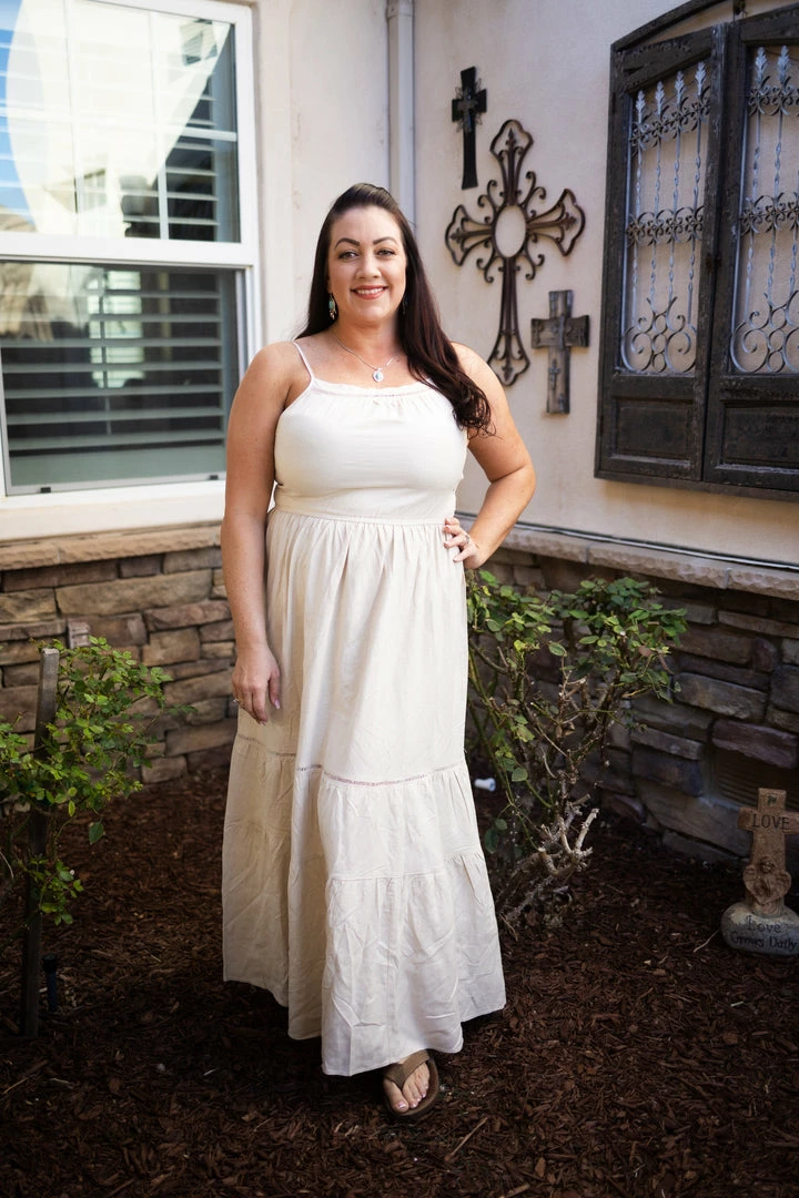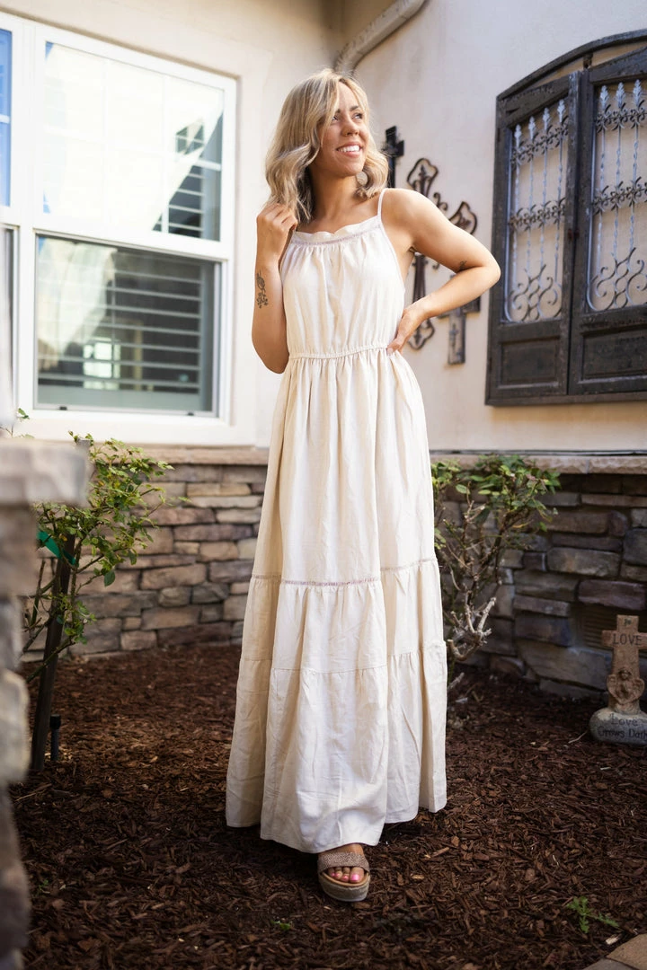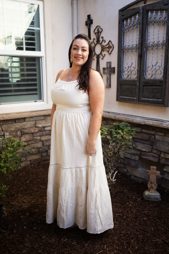 This maxi dress will forever be your one that you cherish for all your days. The fit, the style, the fabric…everything about it is perfection. With a square neckline, this dress features adjustable shoulder straps, elastic waist and laced details on the neckline and through the skirt.