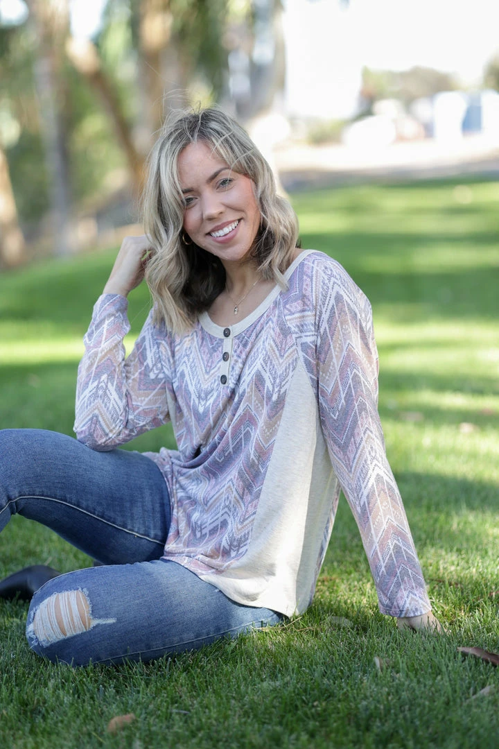 This amazing loose fitting henley is has the perfect neutral color scheme to it. Made from the softest jersey fabric, this top features a scoop neck with button detail, long sleeves and a rounded hem.