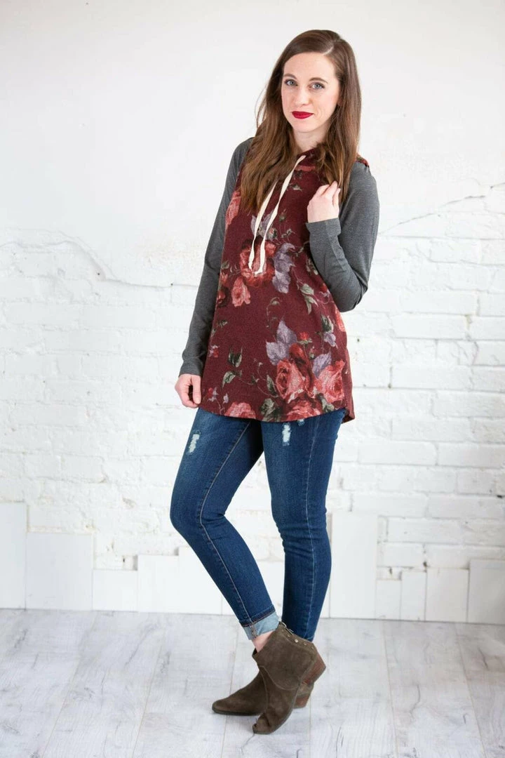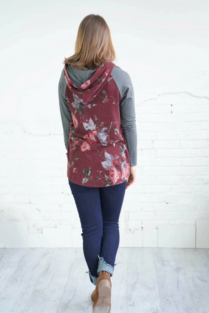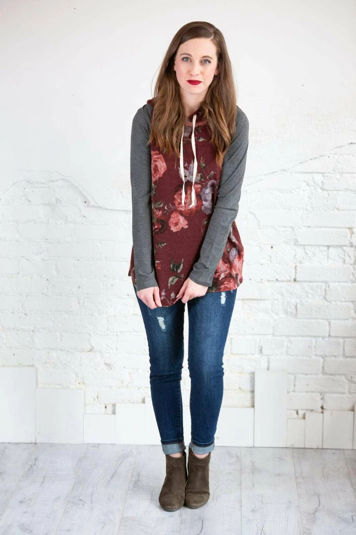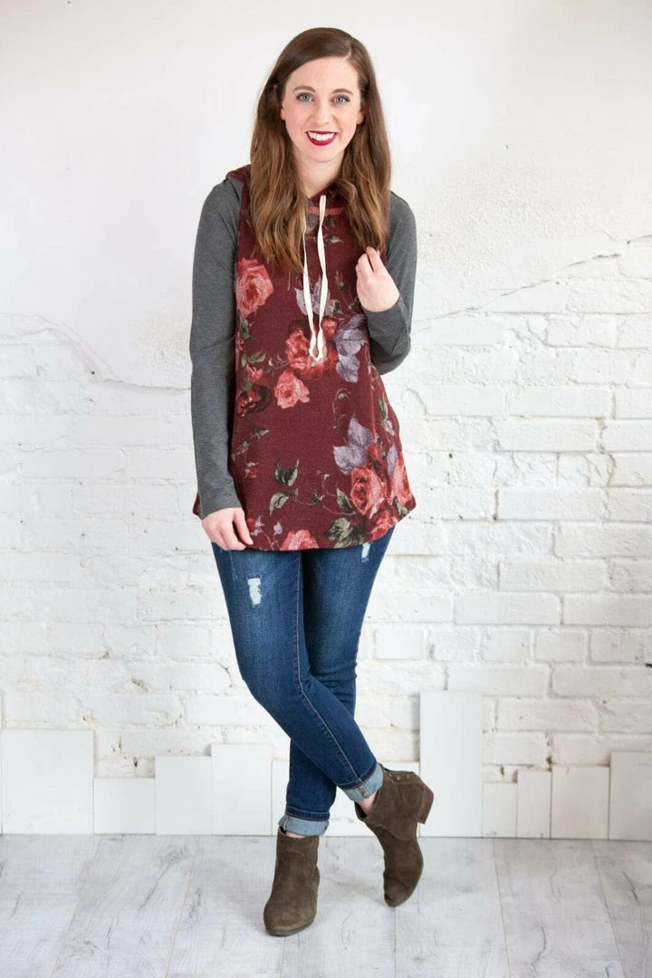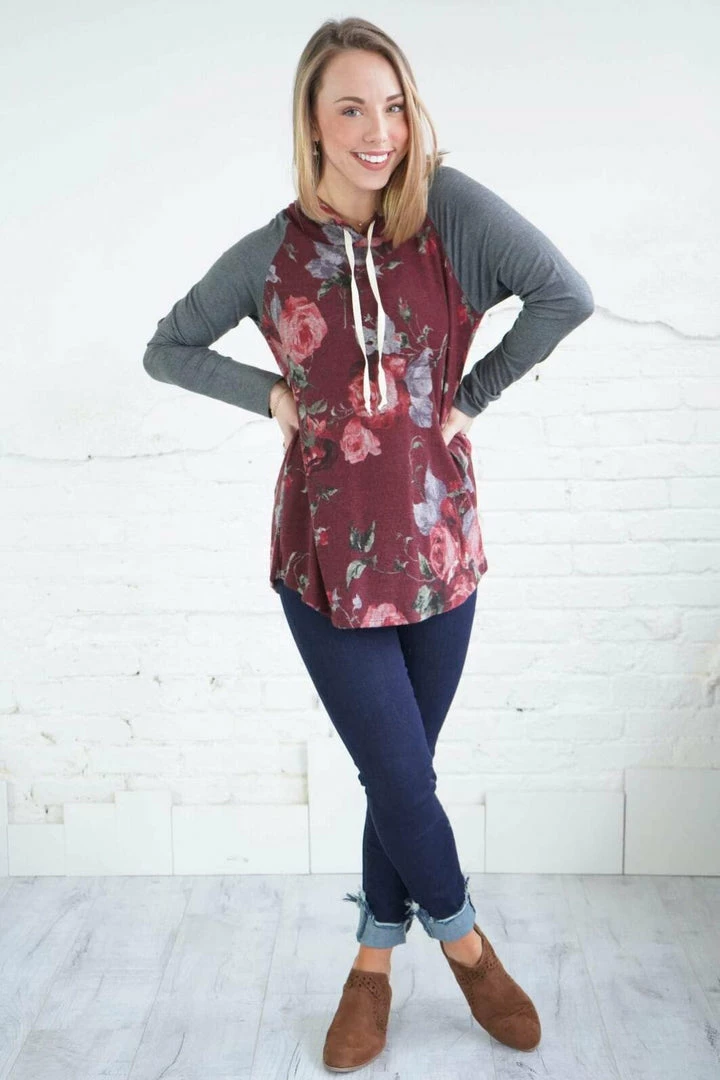 This is a hoodie for all seasons! For those random cooler summer nights, every day in the spring and fall, and layer with a denim jacket in the winter! This piece will never get put away! The beautiful, rich floral print makes up the body of this hoodie with contrasting super soft solid sleeves and a curved hi-low hem! Pair with Denim or leggings!