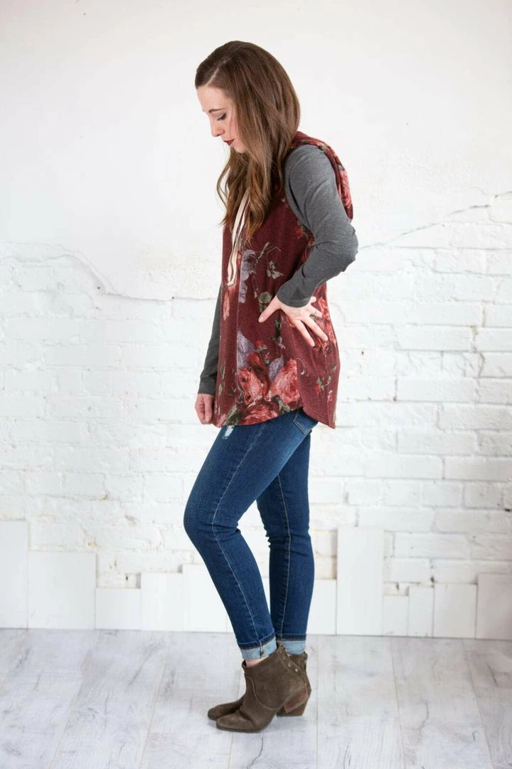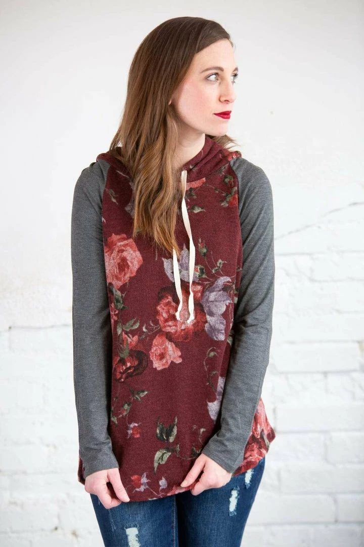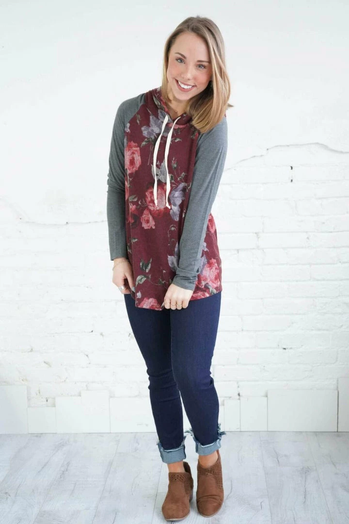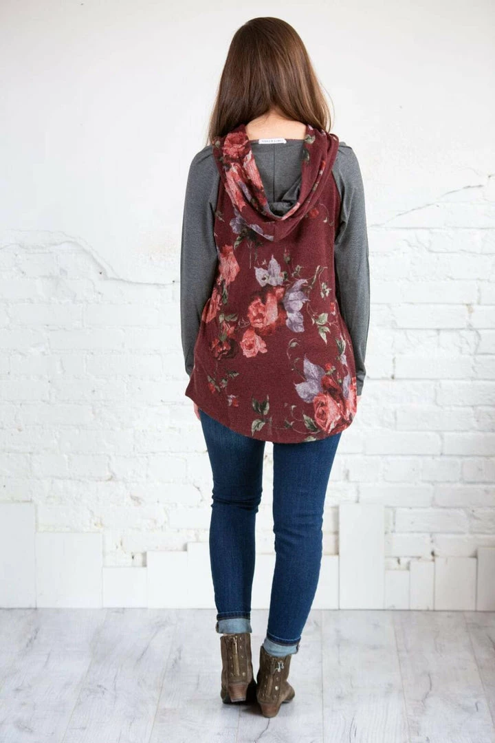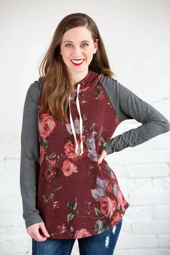 This is a hoodie for all seasons! For those random cooler summer nights, every day in the spring and fall, and layer with a denim jacket in the winter! This piece will never get put away! The beautiful, rich floral print makes up the body of this hoodie with contrasting super soft solid sleeves and a curved hi-low hem! Pair with Denim or leggings!