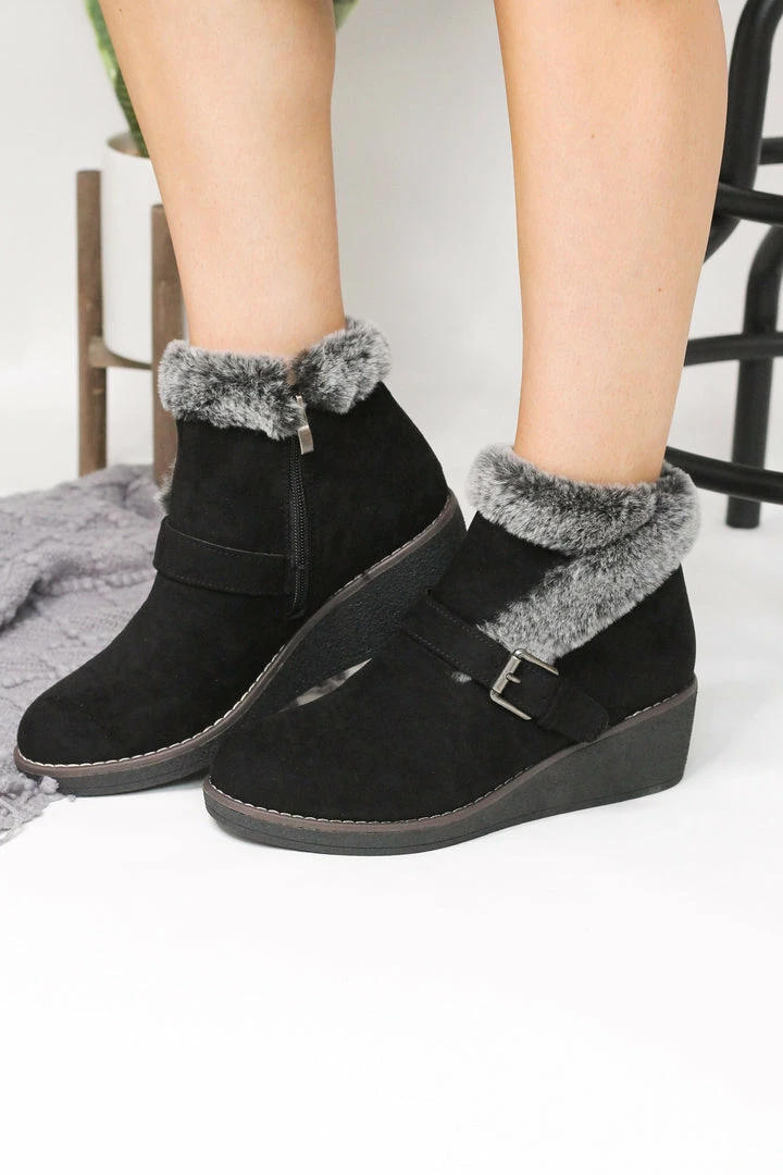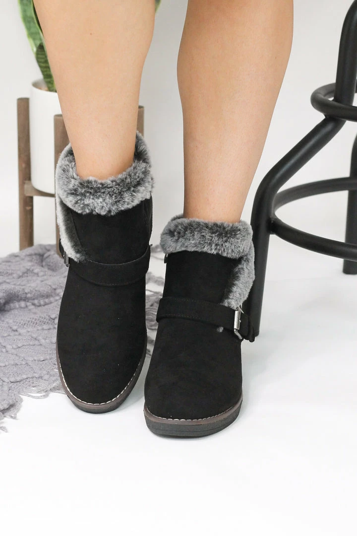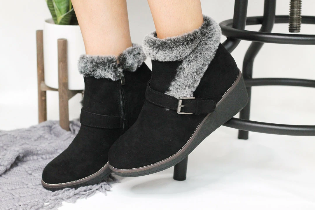 Ankle boots are perfect to put on when the weather gets chilly! Featuring a luxurious faux suede exterior and faux fur topper trimming the edge, these boots have you ready for colder months.
