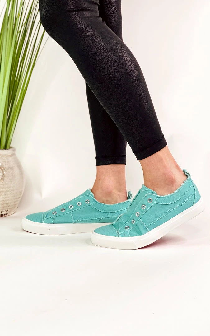 The Corky’s “Babalu” slip-on sneaker features a teal fabric, eyelets and a rubber sole.