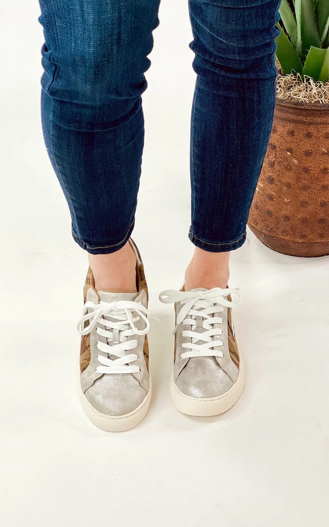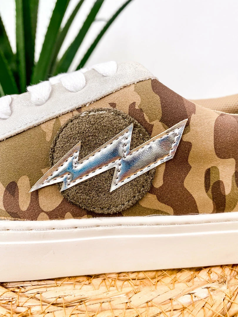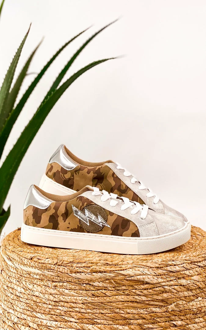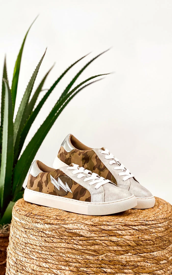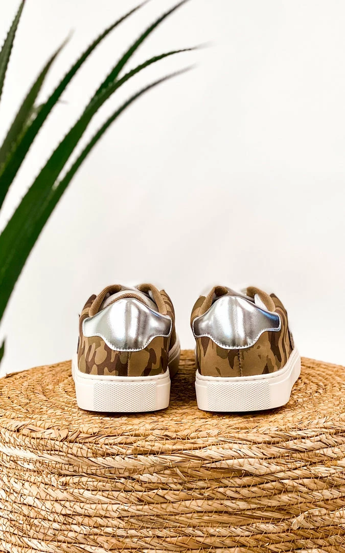 From casual nights out to walking the boardwalk, these beautiful Camo Print sneakers are a stylish choice for those always on the go! The metallic details had a bright touch. The Camo Print sneaker features a silver glitter print at tongue and toe.