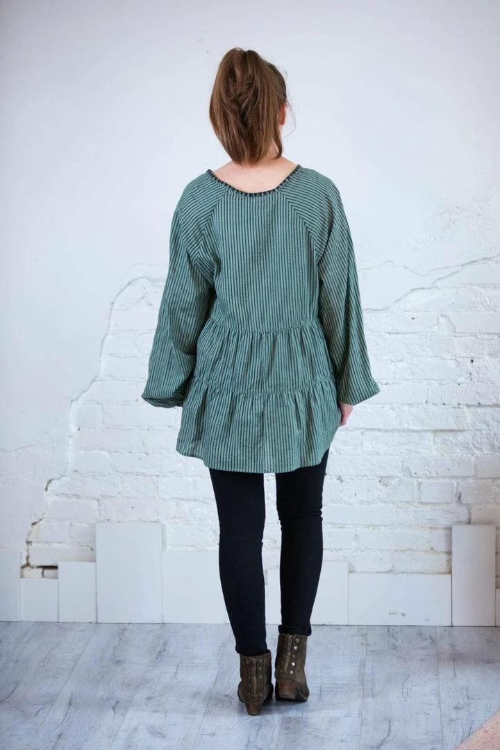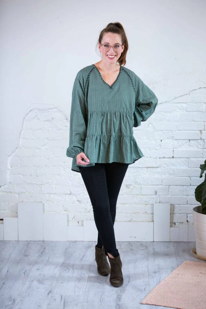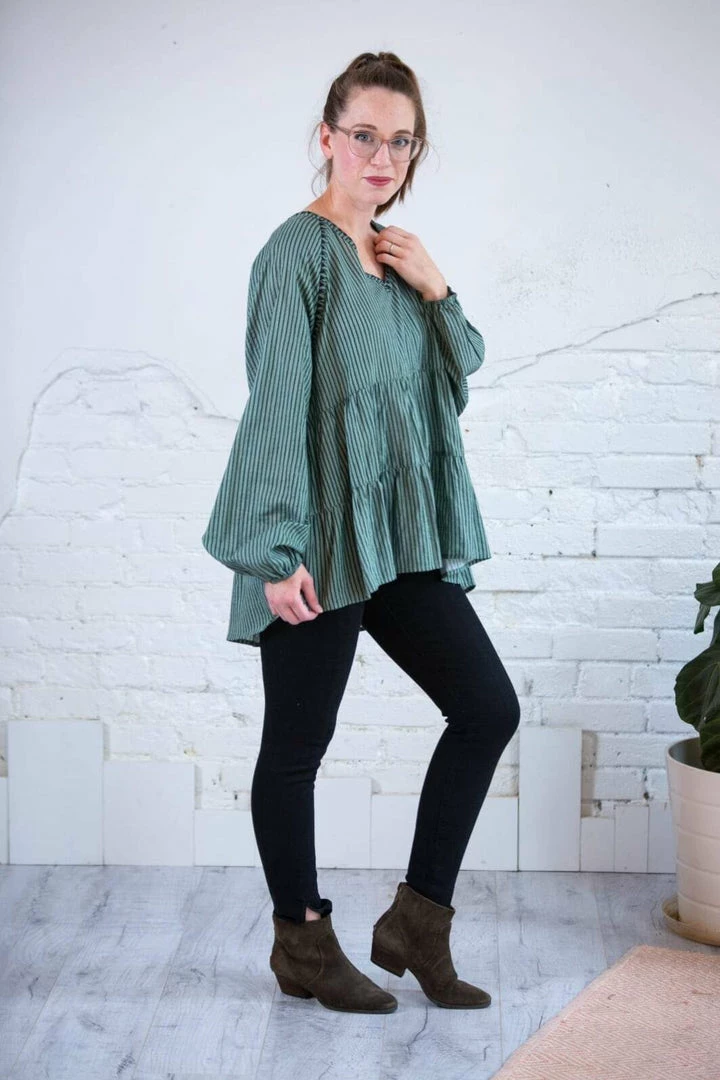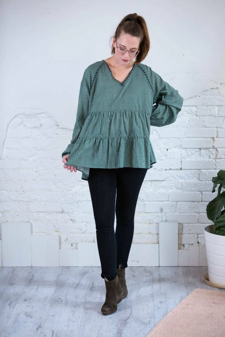This Striped Tiered Top is soooo dreamy! Throw on with a Tulip skirt for the office or jeans and booties for the perfect year round casual look! This soft, rich green goes in EVERY SEASON! Skinny stripes, 3 tiers, with embroidery detail around the collar and sleeves and an elastic cuff sleeve. Again, I say Dreamy!