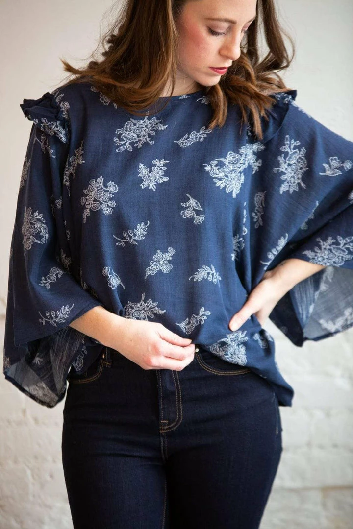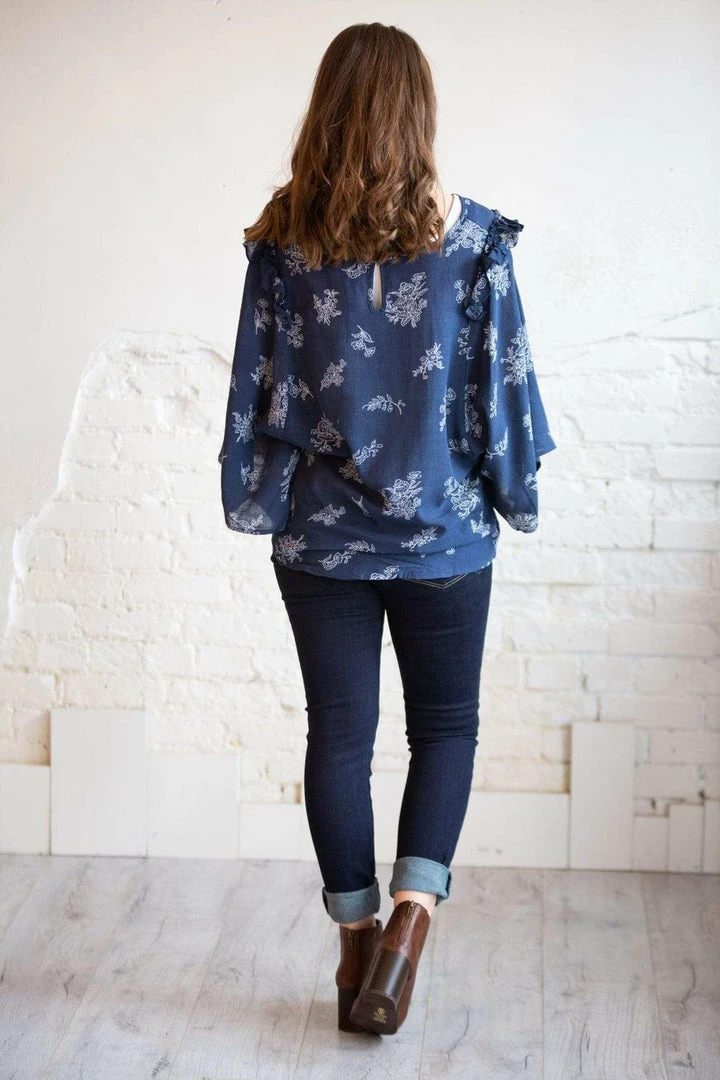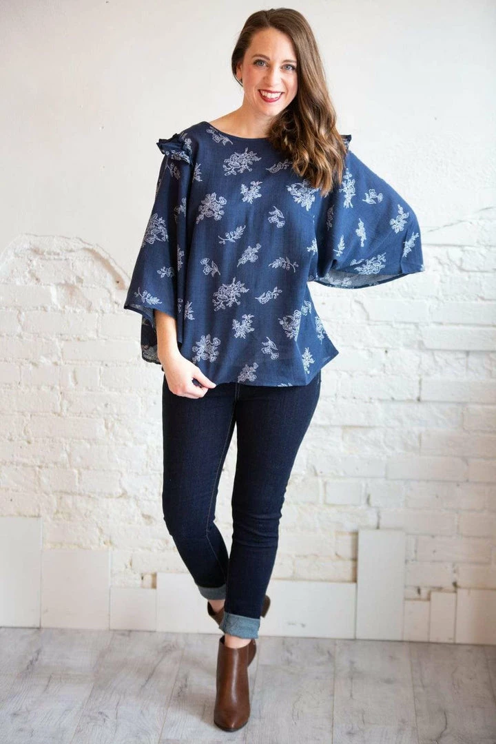 Sweet like a floral blouse! The Waverly Ruffle Sleeve Blouse is a beautiful navy blue blouse with the daintiest floral print throughout. With a simple relaxed style, and beautiful ruffle sleeve this blouse is ready to be worn with your favorite pair of denim or a trouser! The sleeves of this blouse are what steal the show, look at those ruffles – truly stunning and oh so elegant!
