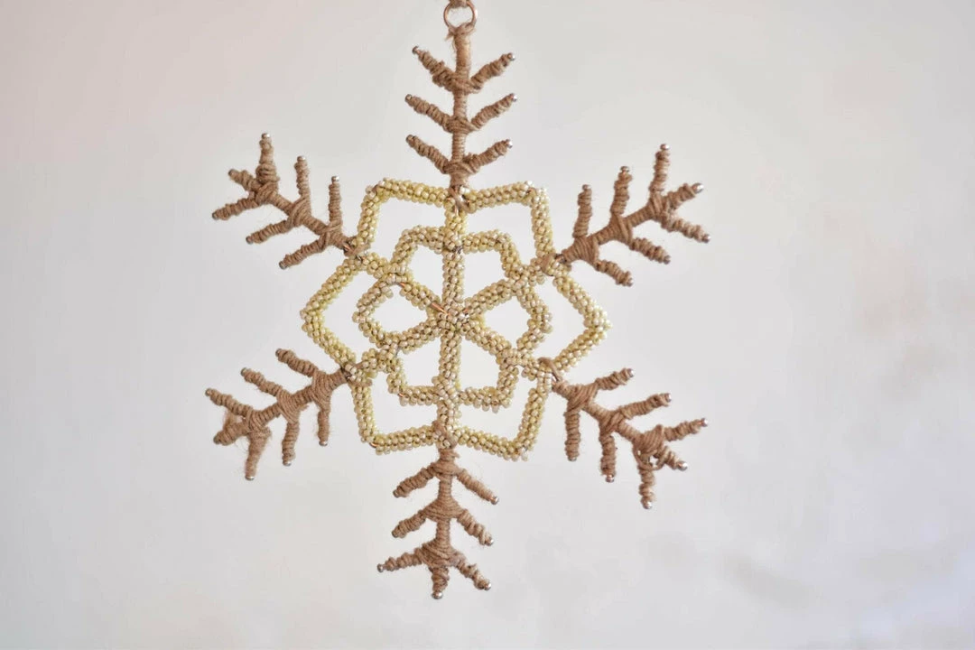7-1/2″H Jute & Glass Bead Snowflake Ornament. The natural elements of jute and the addition of the unexpected shimmer of glass beads, this beauty becomes a little magical, just like snow.