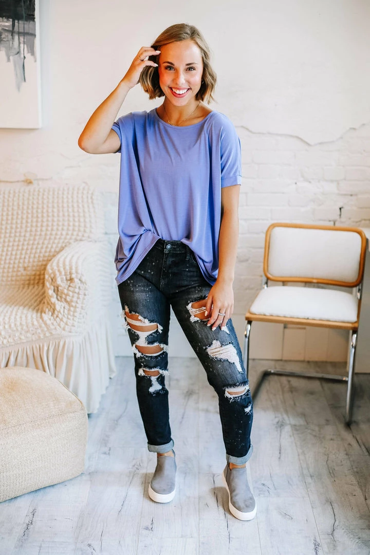 This top has a nice loose fit that makes her super easy to wear with your favorite boyfriend jeans or cardigan. This stunning color does not quit. Her fabric is 77% modal. Modal is a crazy soft and stretchy fabric that makes you never want to take this top off! Is our GHG motto, “looks like date night, feels like jammies?” It’s not, but maybe it should be. In short, you need this top in your life.