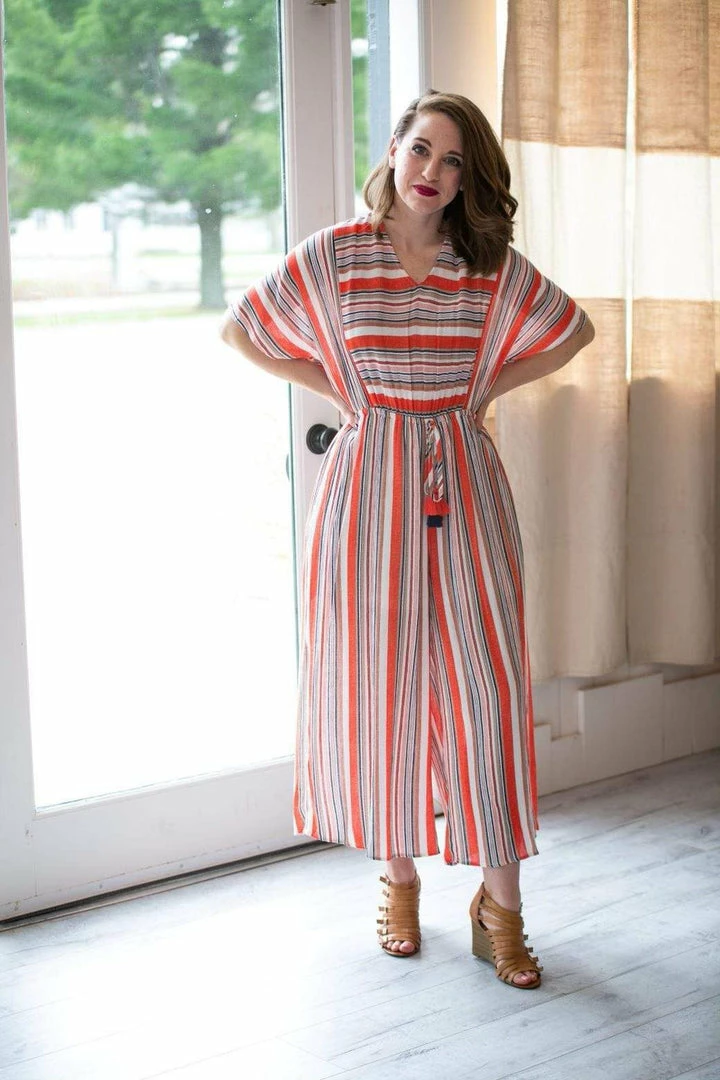 I can see this piece strolling down a beach barefoot with a sunhat. A jumpsuit that would be perfect for any occasion, but just makes me think vacation! Wide leg, dolman sleeves and a sweet tassel tie makes this gorgeous on every body type. And the color way just makes me happy.