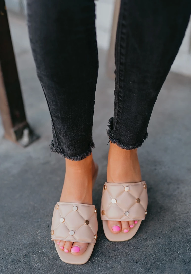 The latest in our gorgeous Rollasole collection, designed for both eye catching style along with Rollasole comfort. These light brown quilted sandals are perfect for a day by the pool or a lazy stroll through the mall. The refined square toe with padded sole is complimanted by the gold studs. A perfect style for a sunny day!