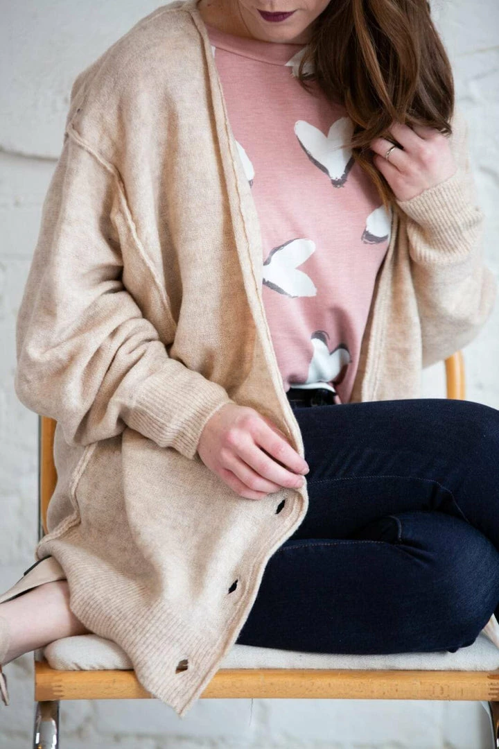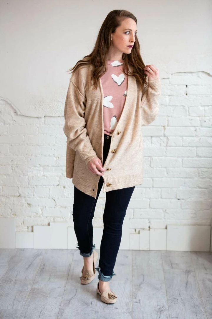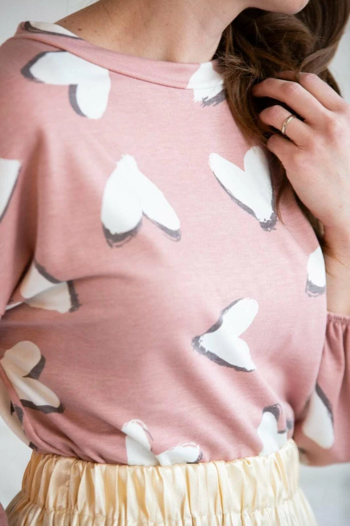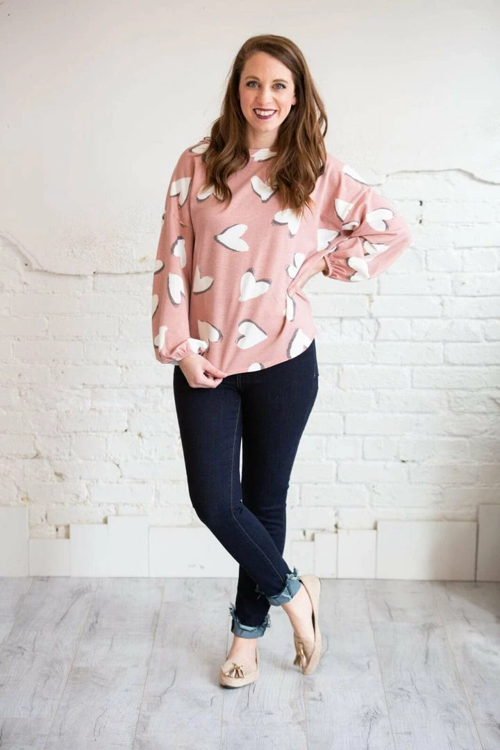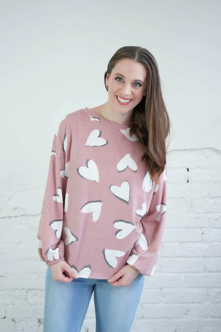 This soft pink heart top keeps it casual and cute. The french terry fabric and ivory heart with mocha outline add a touch of sweetness to this easy to wear piece. We can all use a little more love in the day!