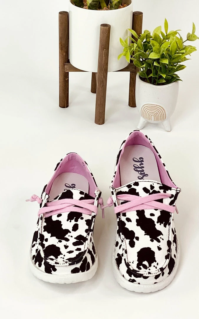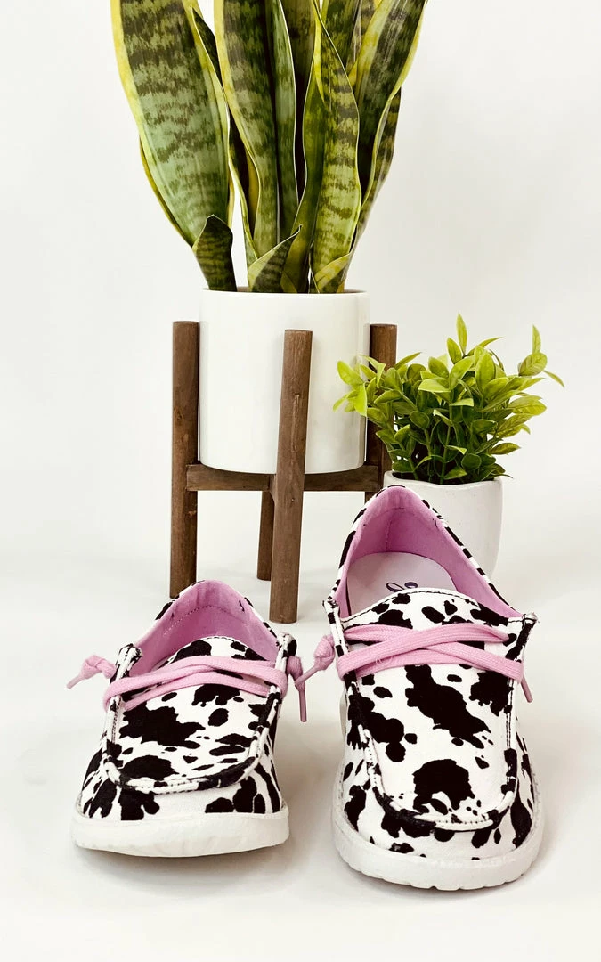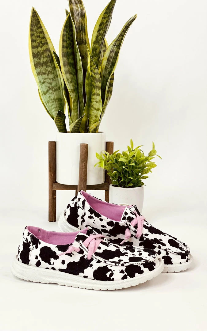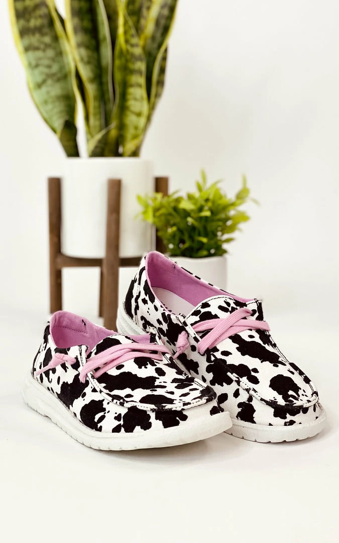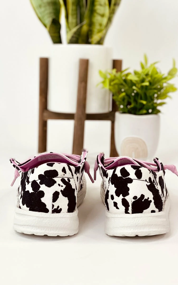 This awesome sneaker has a fun cow print style design!