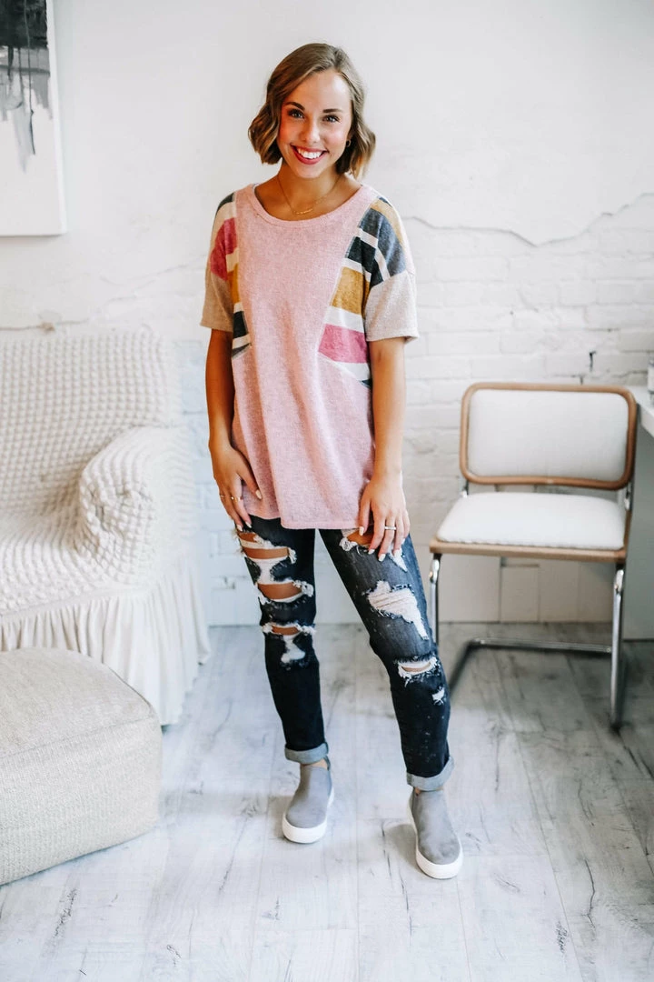 Are you ready for outdoor concerts and ballgames? I know we are! Stroll up to your first event in this fashion forward knit top! The stunning soft blush color way with contrasting stripes gives the most gorgeous shape to the body, all while feeling like you are wearing a t shirt! Yes! This is softer than a t shirt. The wide crew neck and sleeve length make this the easiest top to wear with anything from denim to a tulip skirt and cute sneakers!