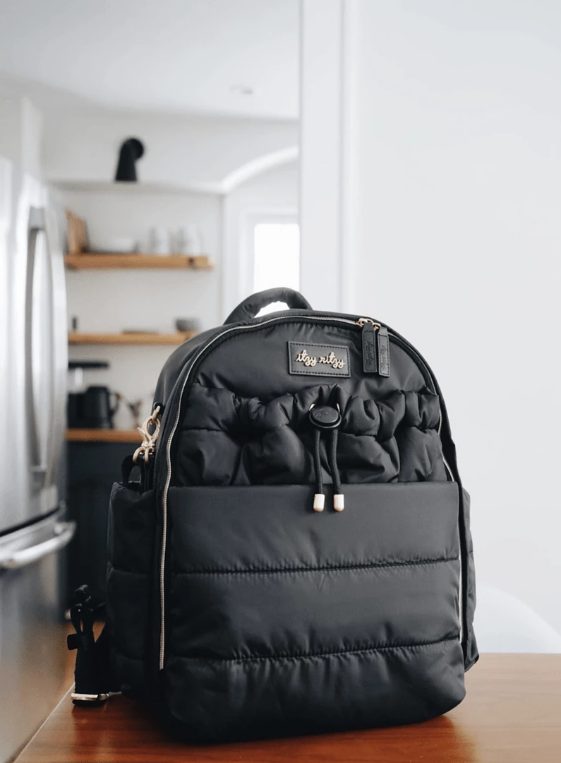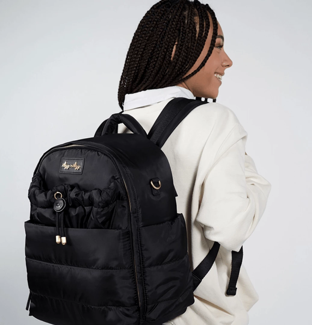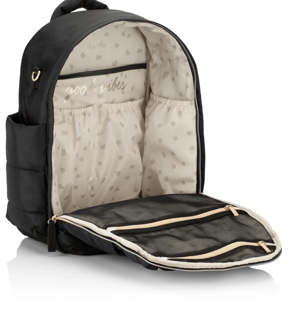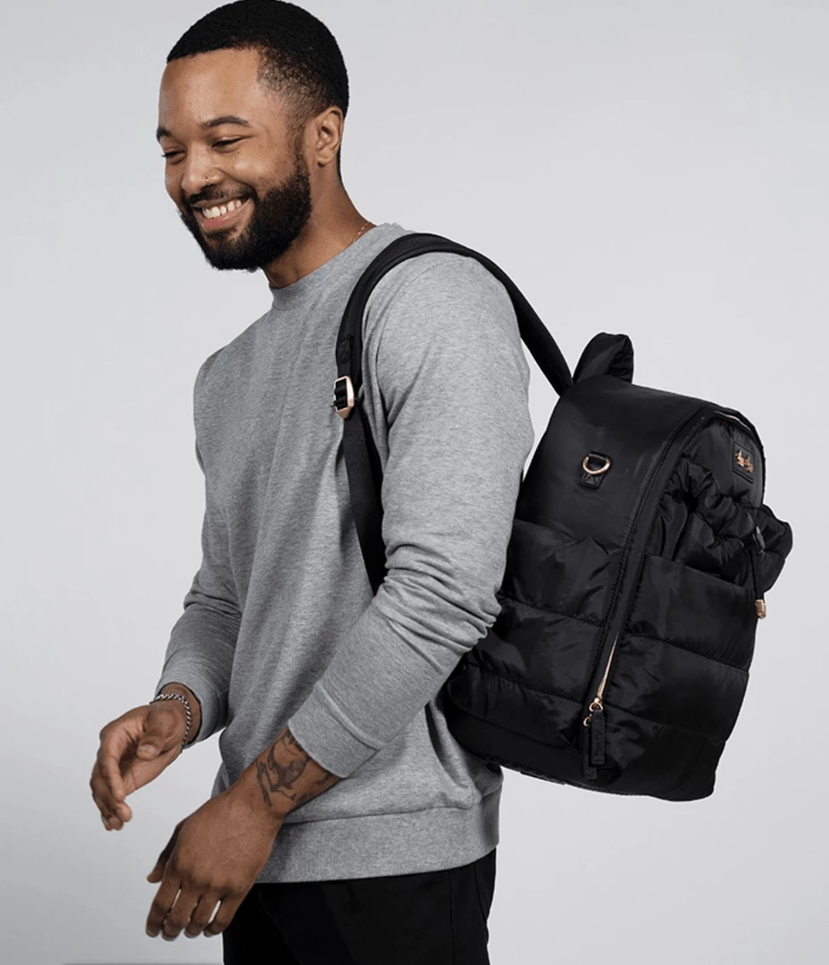 Built for those with their head in the clouds and their feet (usually running around) on the ground, our Midnight puffer style diaper backpack makes a total statement while balancing form and function. The lightweight and airy construction is made for those looking to grab and go, while the laidback and luxe design effortlessly creates a major style moment Take this baby anywhere, with 14 roomy pockets, comfy padded shoulder straps, and endless eye-catching touches—including sleek brushed metal accents, a sporty corded drawstring, and delicate little details that make all the difference. Pack it up and make it a dream come true.