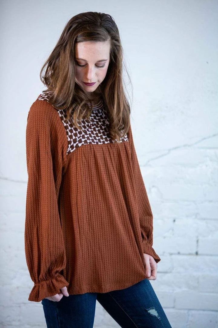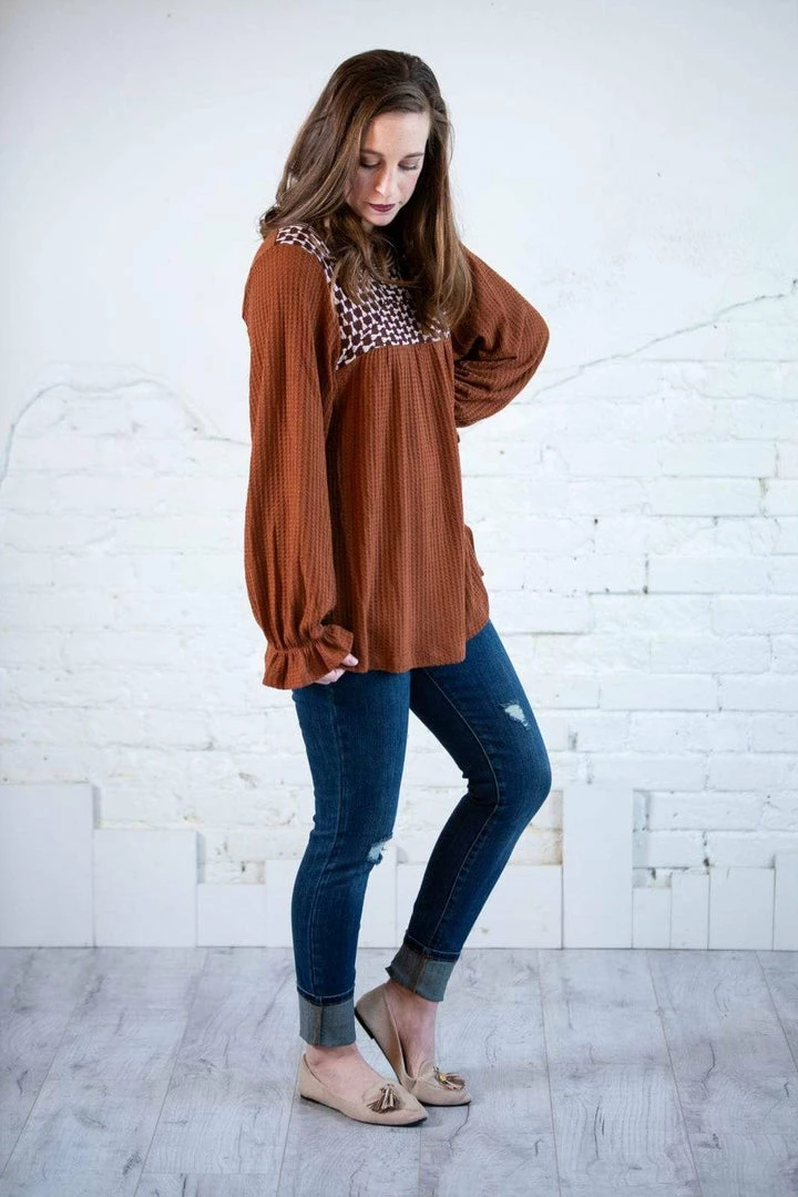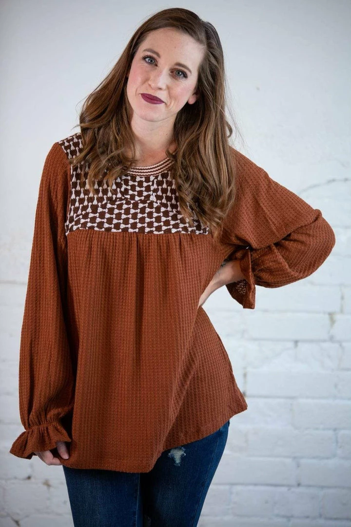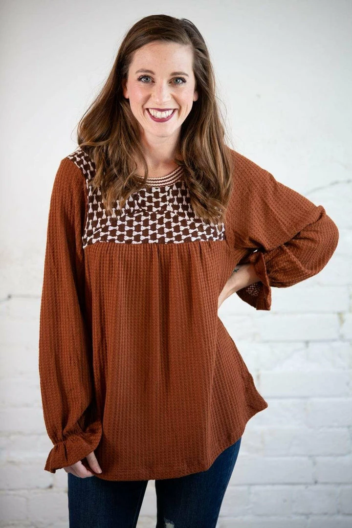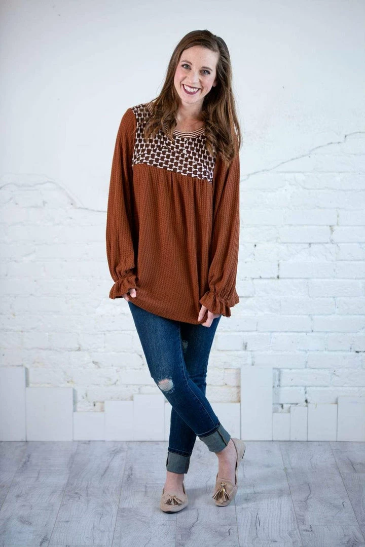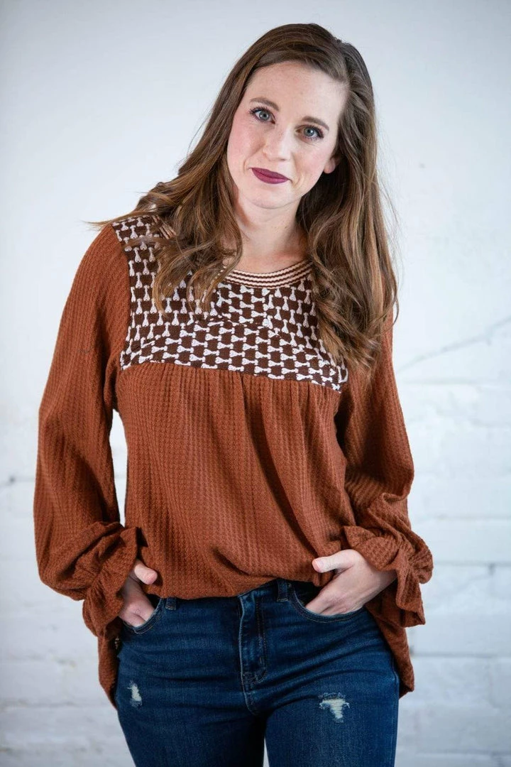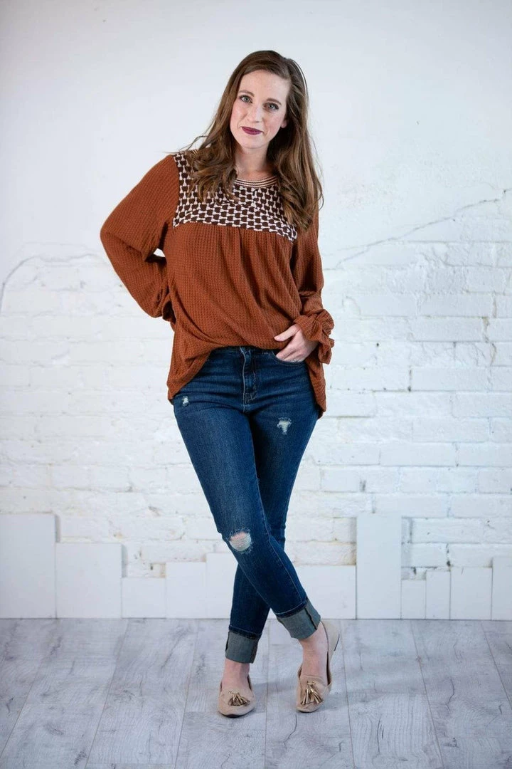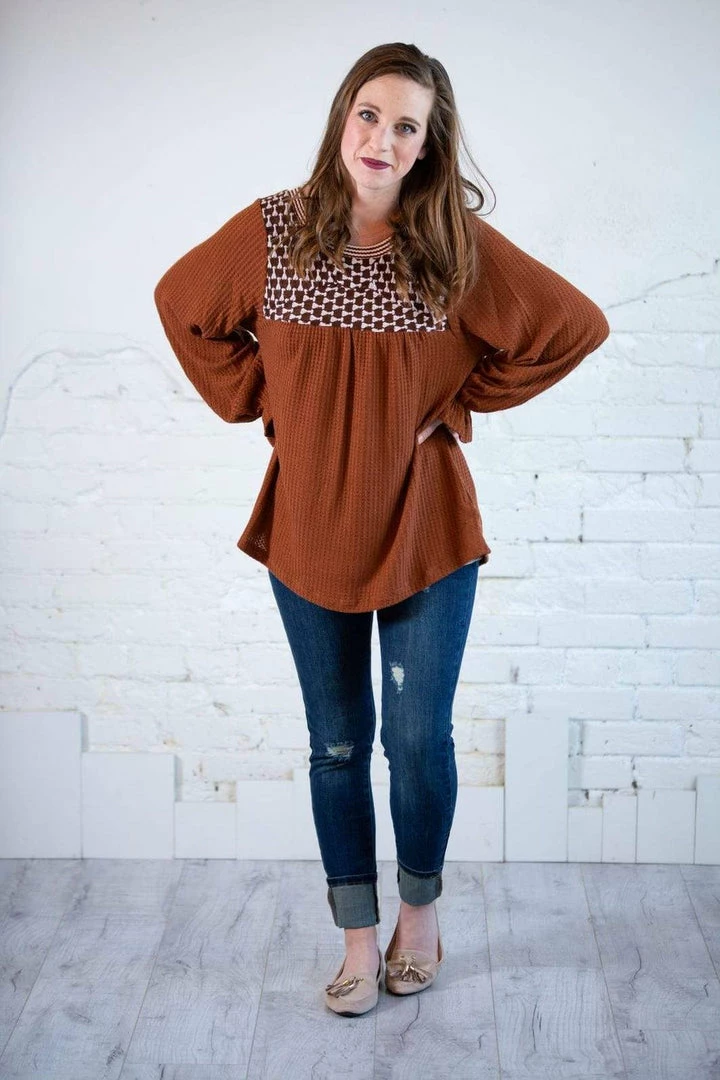 It’s the details with this one. Crochet detail on the front, ruffle elastic sleeve cuffs, balloon sleeve, thermal knit in the perfect fall color!!!!