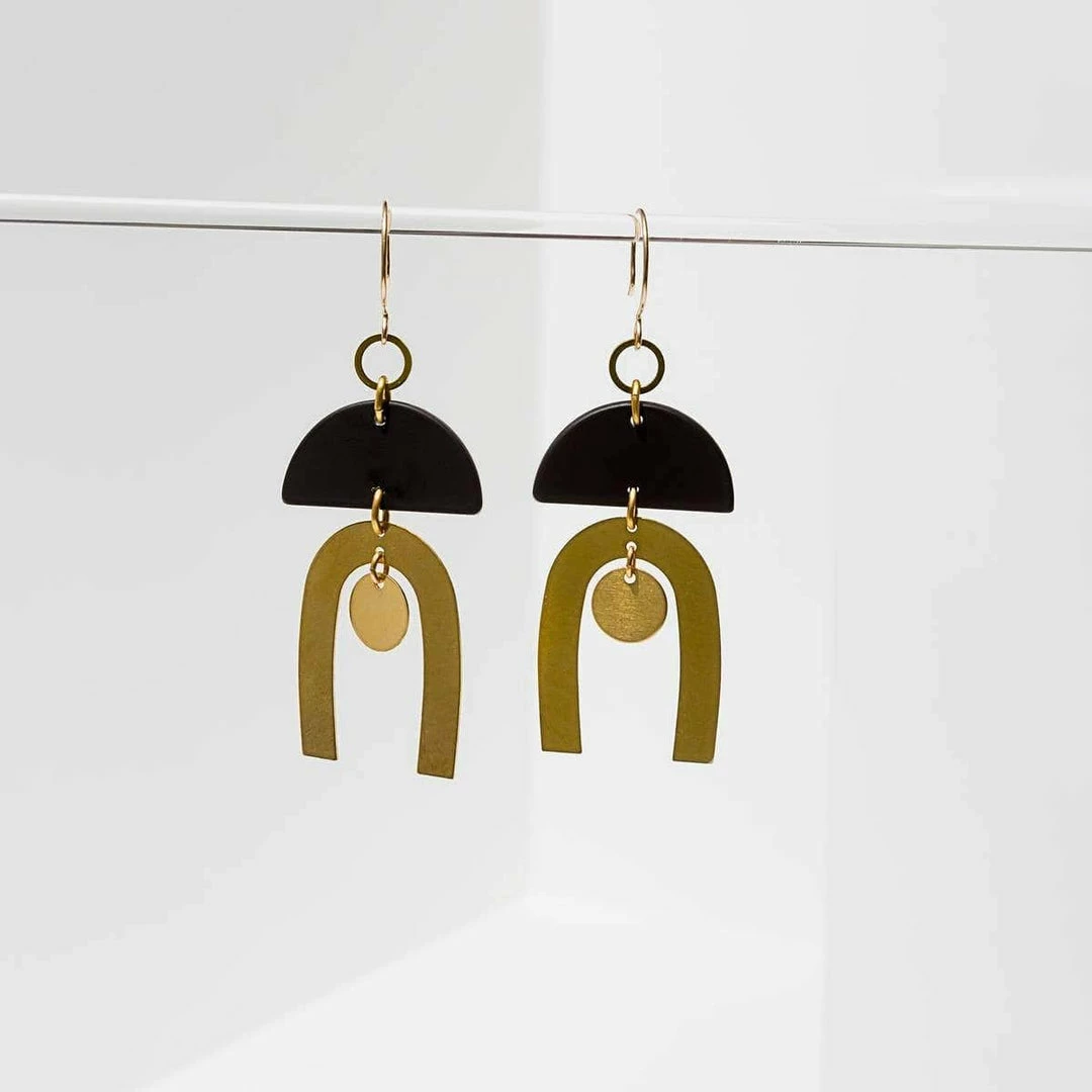 Rubberized half-moon shapes with brass components. Earrings are approx. 3 inches long. Gold filled ear wires.