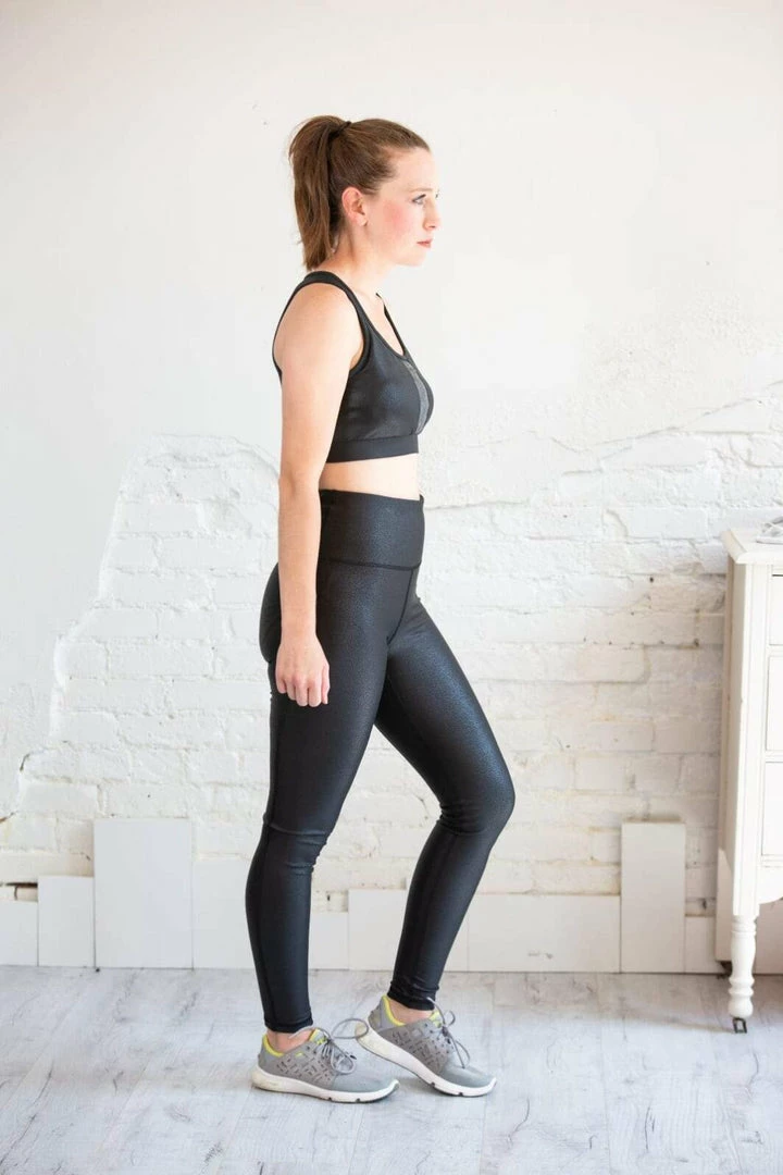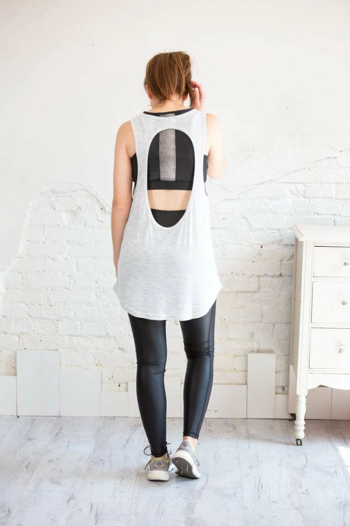 This sports bra features black fabric/black foil with black fabric/silver foil that in the middle of the front and back. The result is an updated, revamped look on the classic silhouette sports bra.