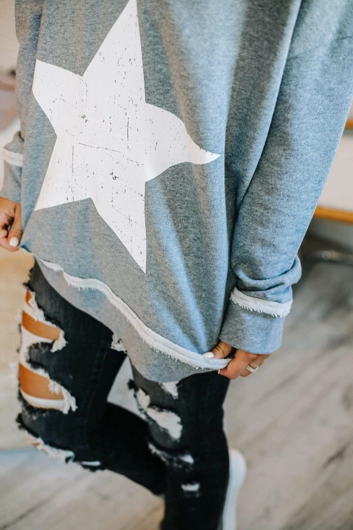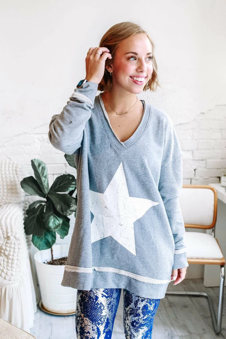We can’t toot the horn of Mono B enough. Everything we get from them is absolutely top quality and top comfort! This fantastic sweatshirt is 100% cotton french terry. The length is perfect to wear leggings with. And we absolutely love the cheetah print star applique.