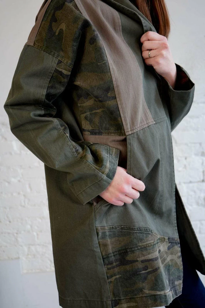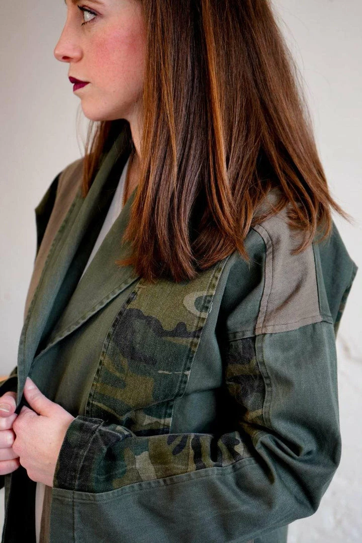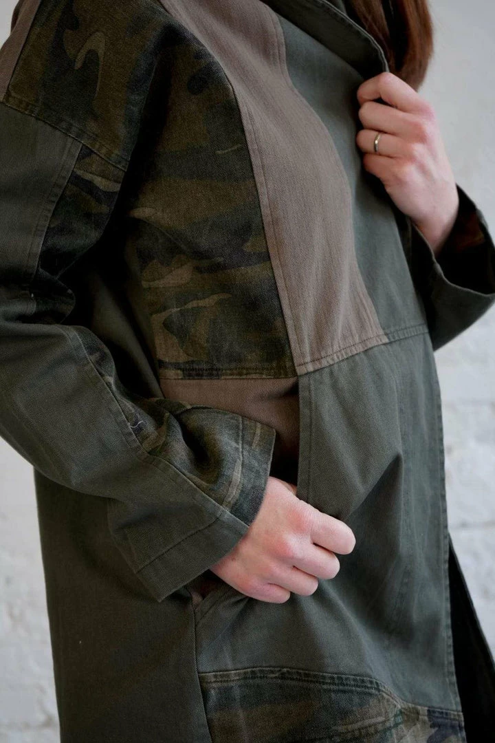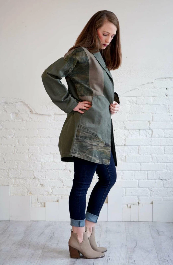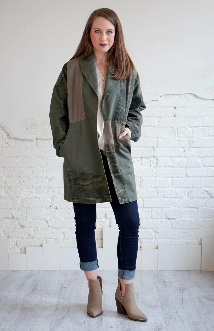 I cannot with this amazing jacket! Olive is such a versatile color in your wardrobe. You can wear it with almost any other color. You can throw on a bright color underneath for a good pop of color, or keep it neutral. Everyone needs an olive jacket! This jacket is a washed canvas feeling fabric with a lot of structure to give the perfect shape. The patchwork camouflage print is right on trend this season! It’s a a long jacket with pockets and zip closure. Perfect for spring and fall and to later with!