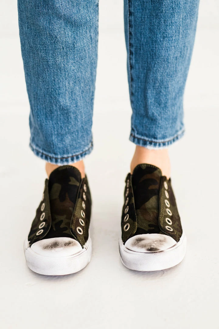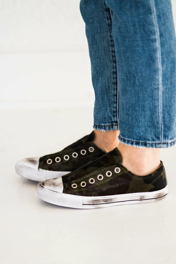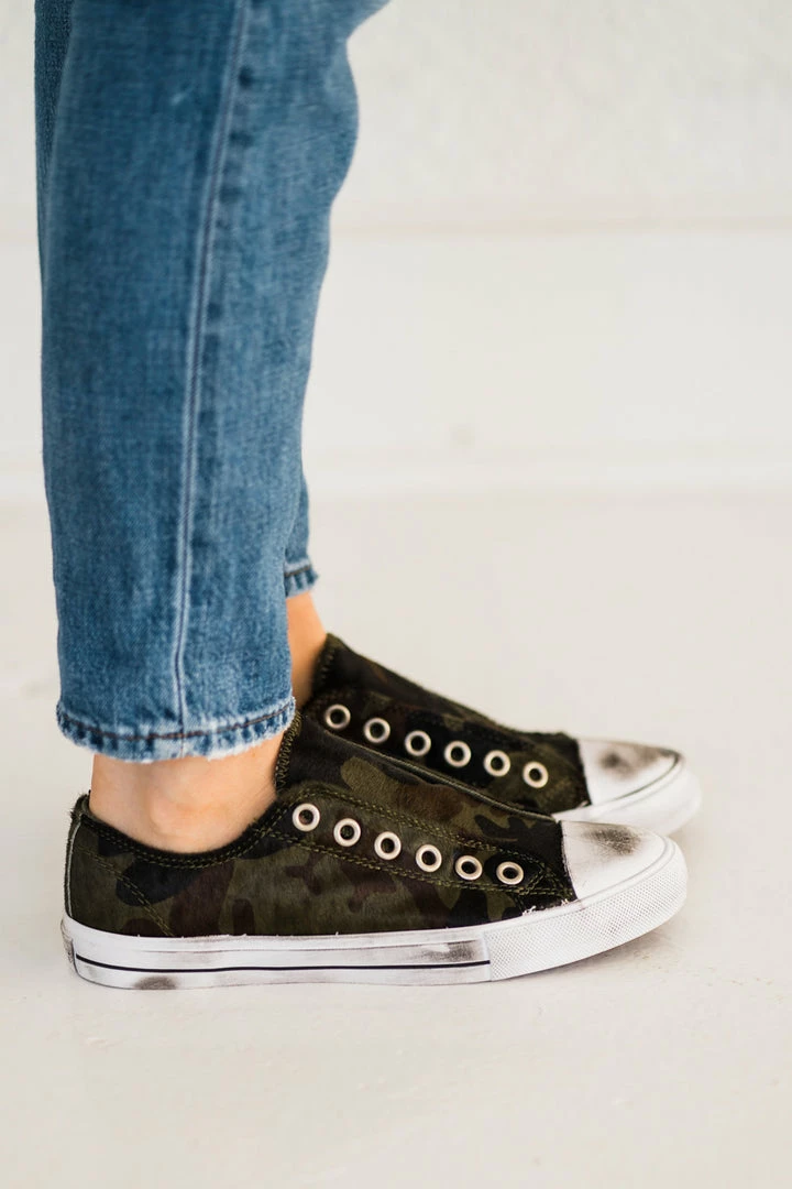 The coolest sneakers yet! The Shalomar sneaker features a genuine cowhide upper, dyed in a camouflage pattern. The tongue is flanked with elastic, allowing the shoe to be a perfect fit, no matter your foot shape. These are finished off with distressed accenting along the white.