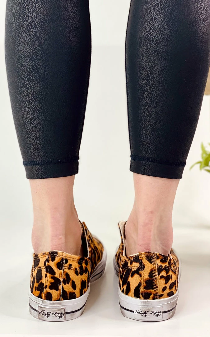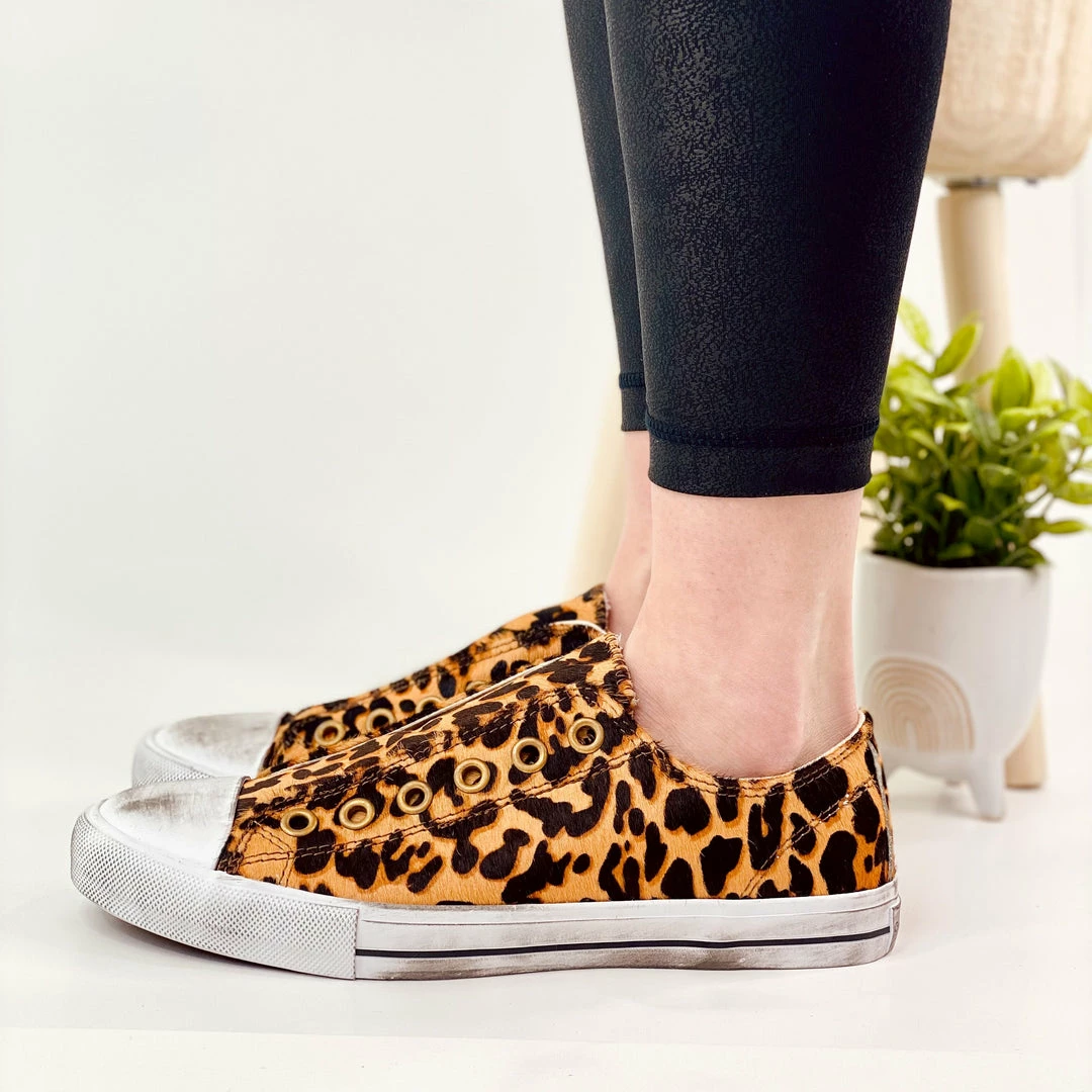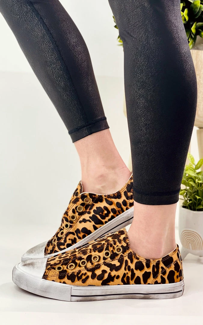 The coolest sneakers yet! The Shalomar sneaker features a genuine cowhide upper, dyed in a leopard pattern. The tongue is flanked with elastic, allowing the shoe to be a perfect fit, no matter your foot shape. These are finished off with distressed accenting along the white.