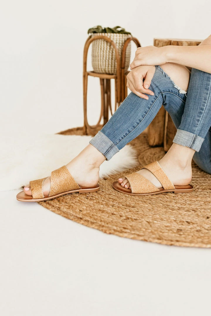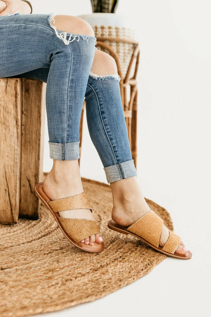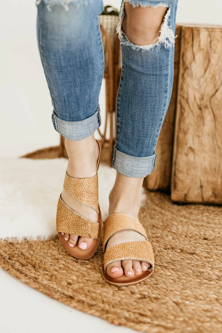 The perfect sandal to add some style, but work as a natural! It features a genuine leather base and hair on hide upper (dyed in a fawn pattern).