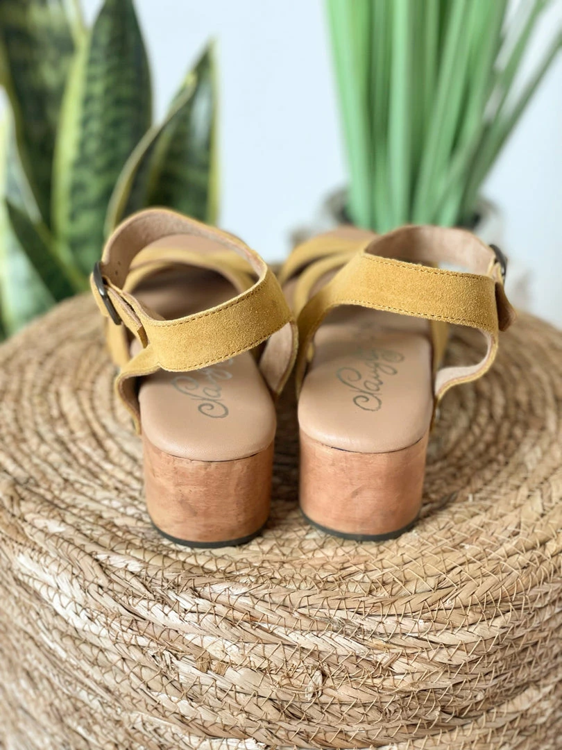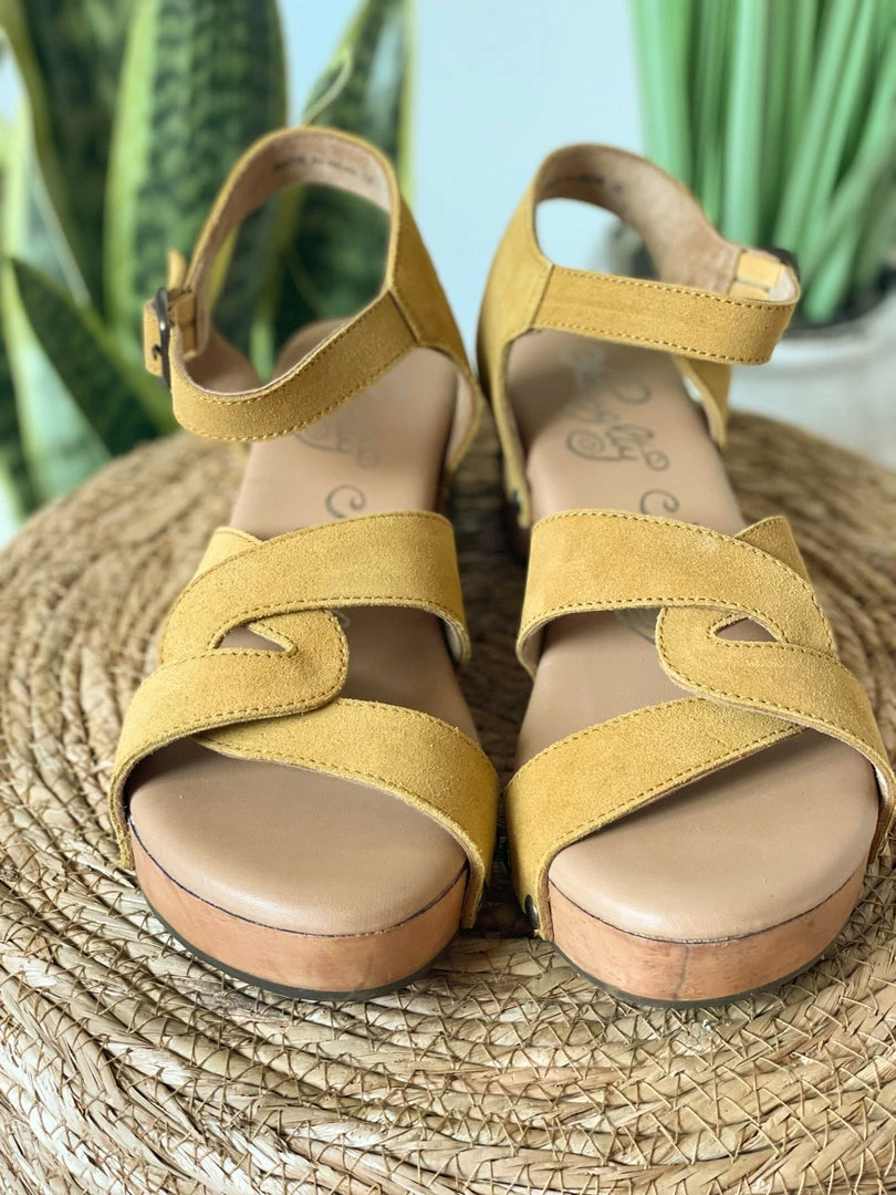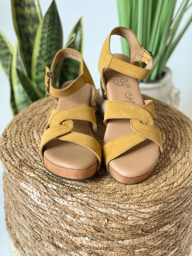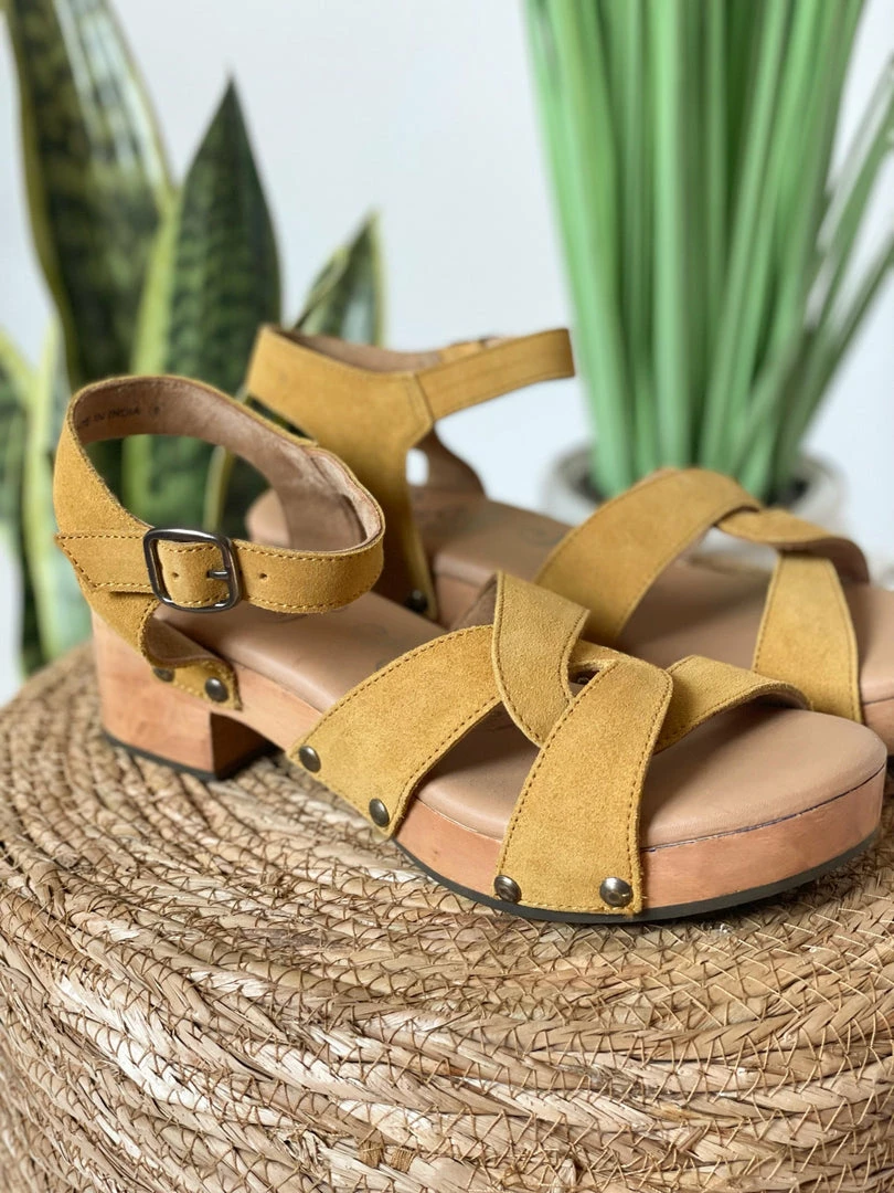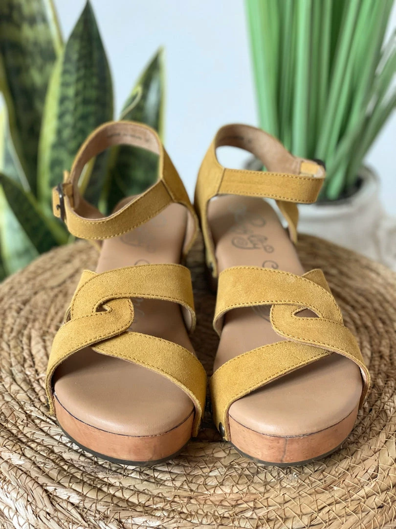 The Strausse sandal is a customer favorite because of it’s style and comfort. This darling sandal features a small wooden heel and a thick comfort footbed. Genuine mustard suede upper and a knotted accent finish this sandal off perfectly!