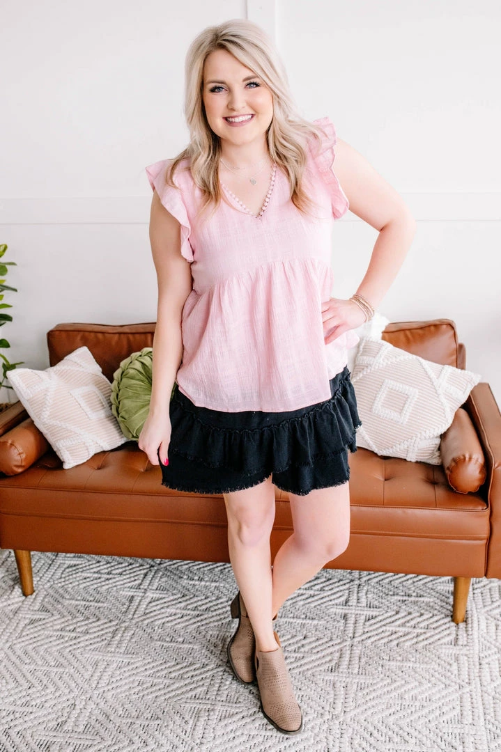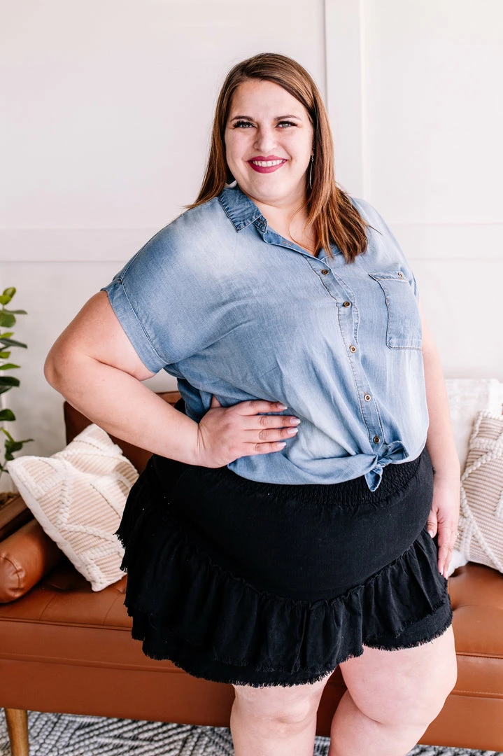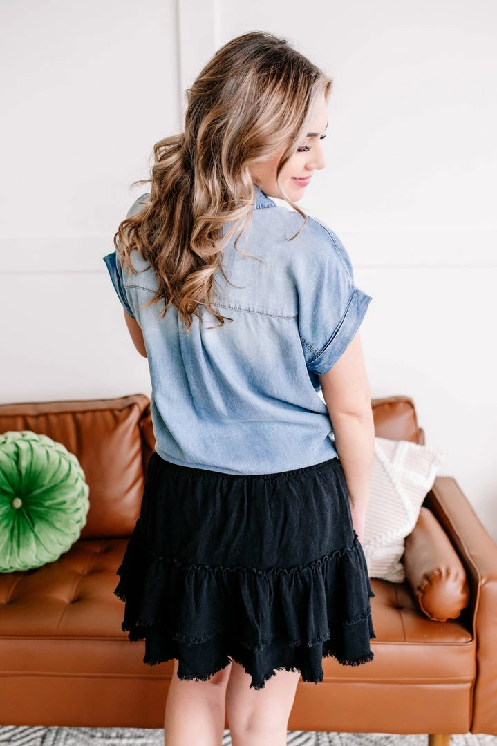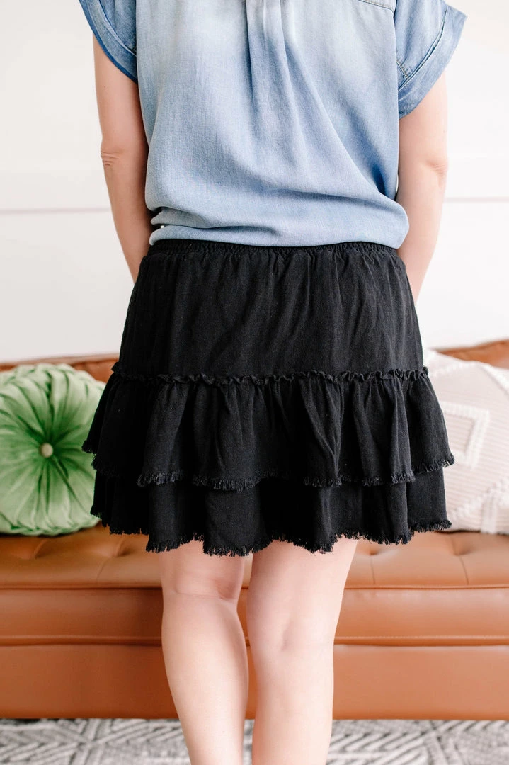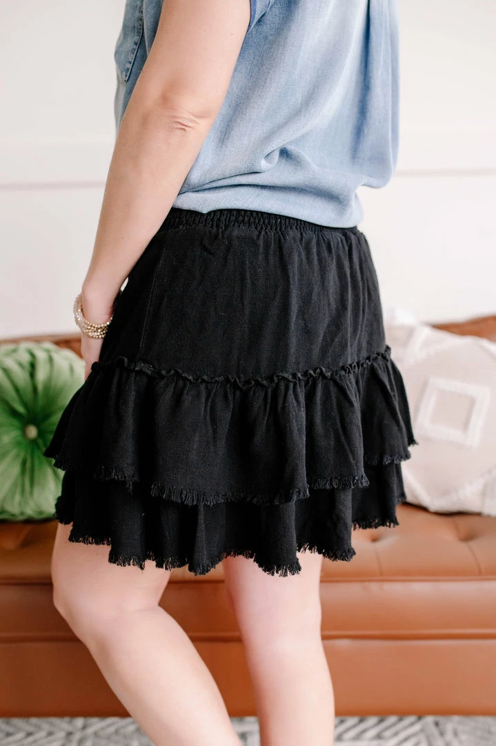 - Tiered, ruffle detail with frayed edge