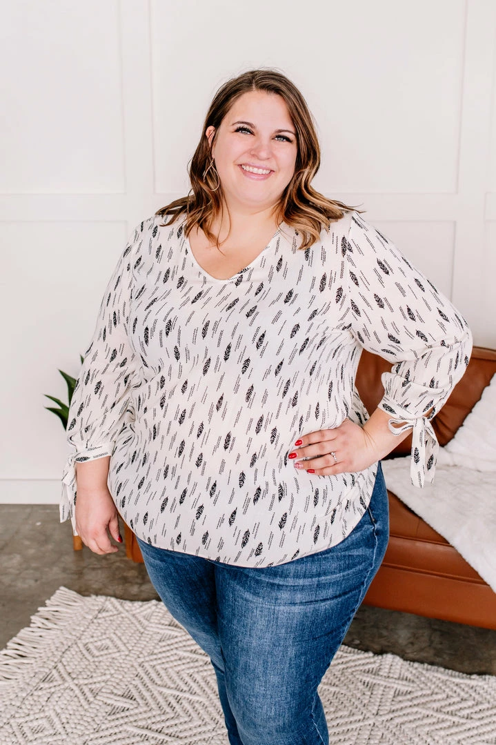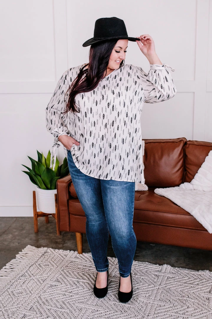 Stay sassy and bold this holiday season with this pretty little blouse. Trendy print, with that fun tie at the wrist, this one begs to be layered under those blazers, jean jackets, and cardigans.