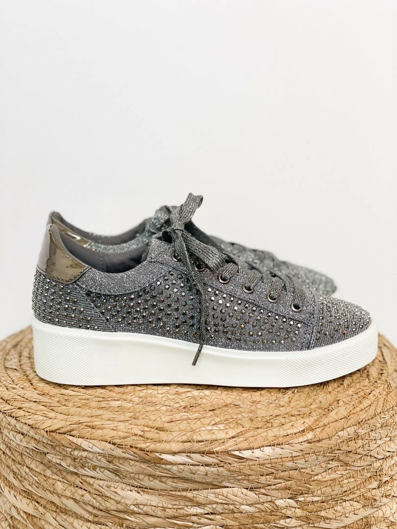 This sneaker is IT and will make the ultimate splash to your wardrobe! The upper features rhinestones throughout with a metallic textile and matching laces.