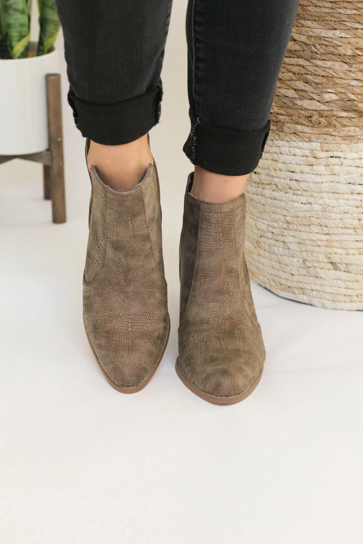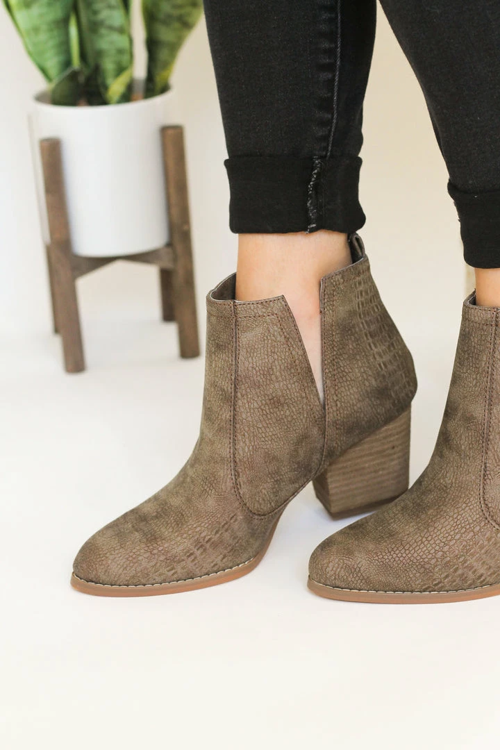 Our top selling silhouette now comes in a rich tan color. The side cutouts allow this bootie to pair with any top of bottom, while the embossing provides a great accent!
