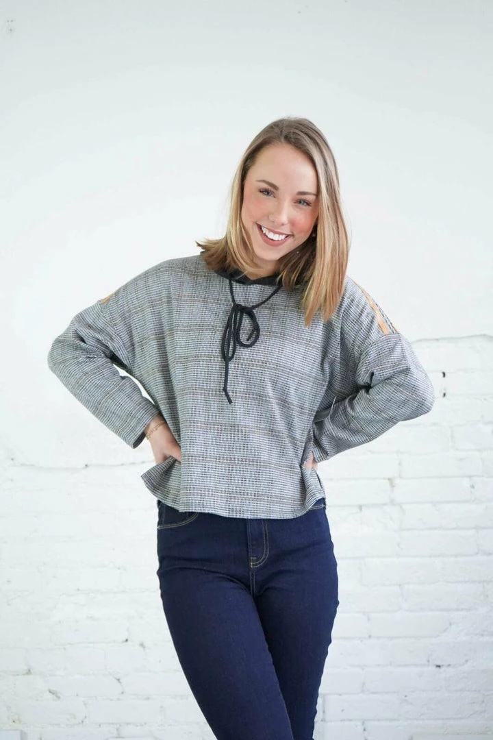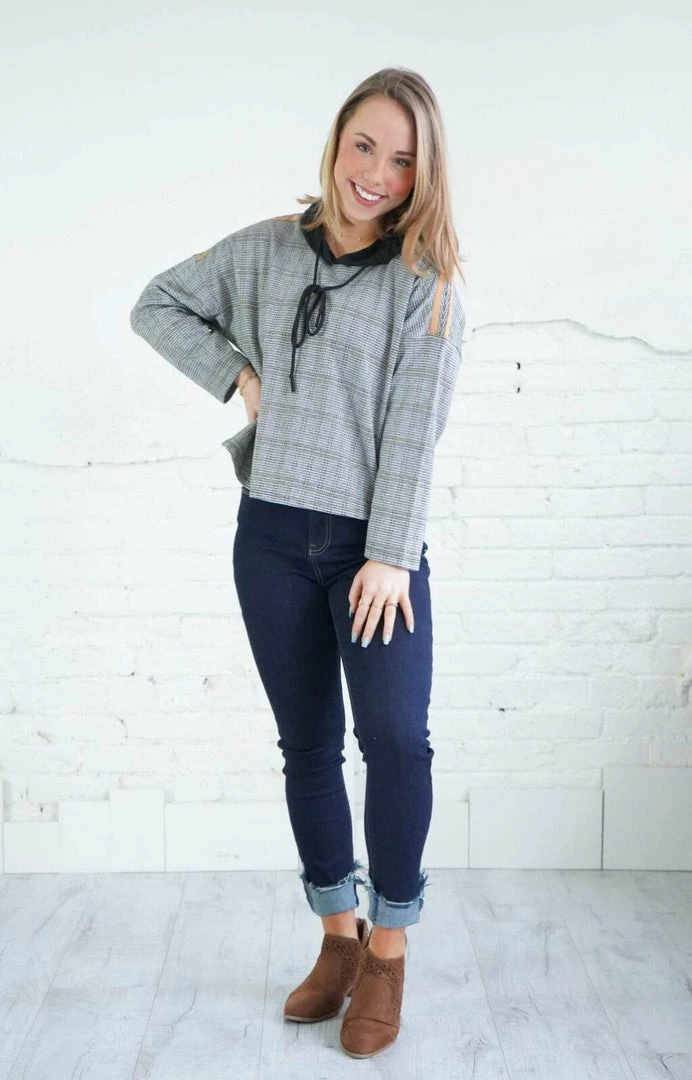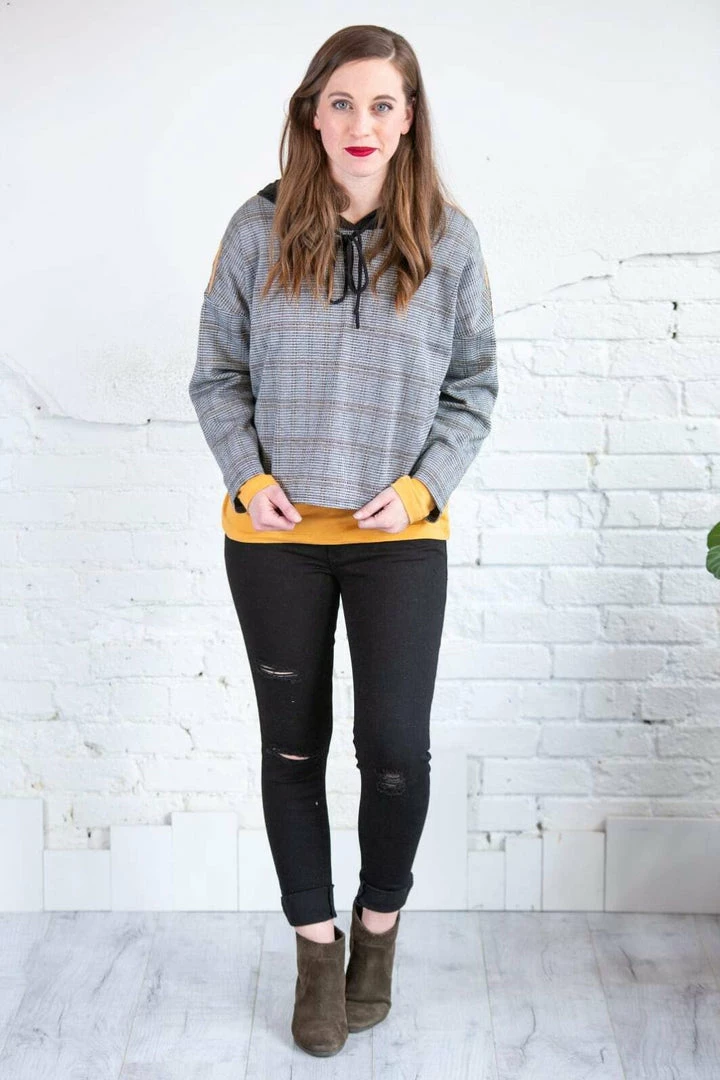 It doesn’t get trendier than this amazing hoodie! This was made for high waist jeans! It features drop shoulder sleeves with mustard stripe detail, side slits, a good with functioning draw string. It’s a slightly cropped length in a relaxed fit in ablack, grey and mustard plaid patter that will have you feeling trendy and comfortable!