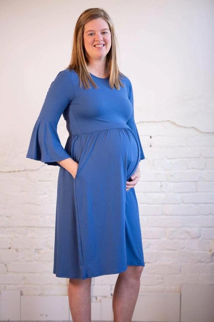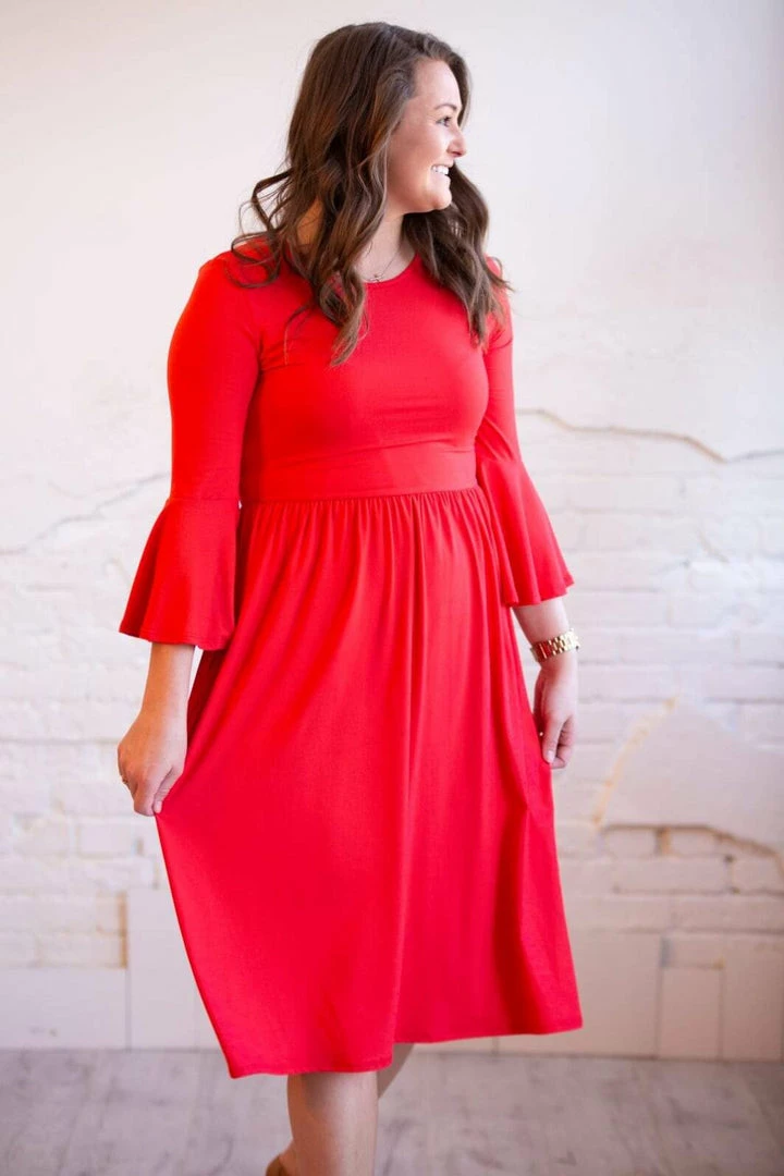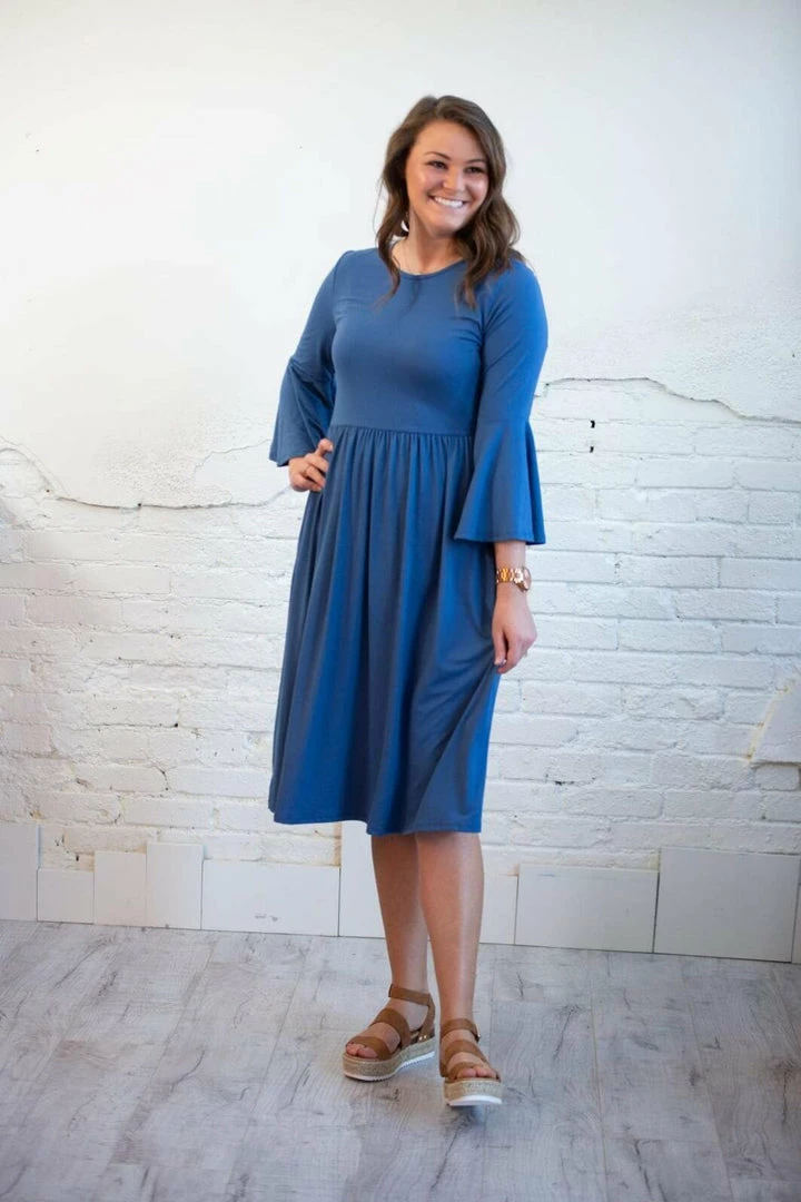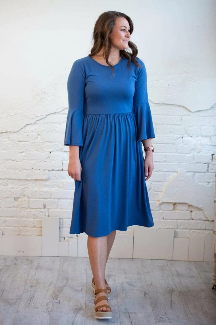 Basic fit and flared dress featuring bell sleeve, soft and buttery high quality solid poly spandex
