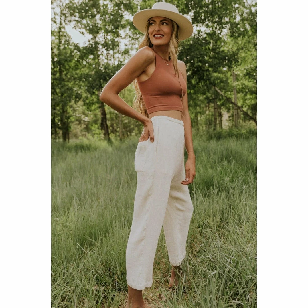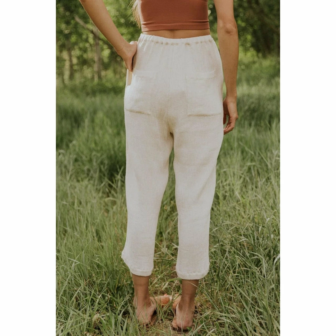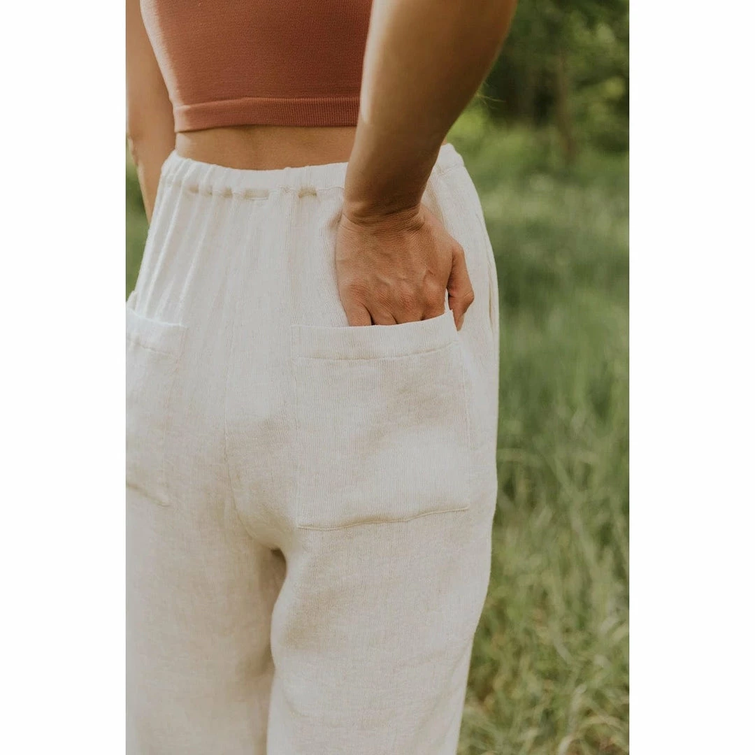 These lightweight pants have 2 patch pockets and 2 front pockets with a half elastic waist on the backside. Made from a quality, linen blend material. You will want to add these neutral pants to your collection!