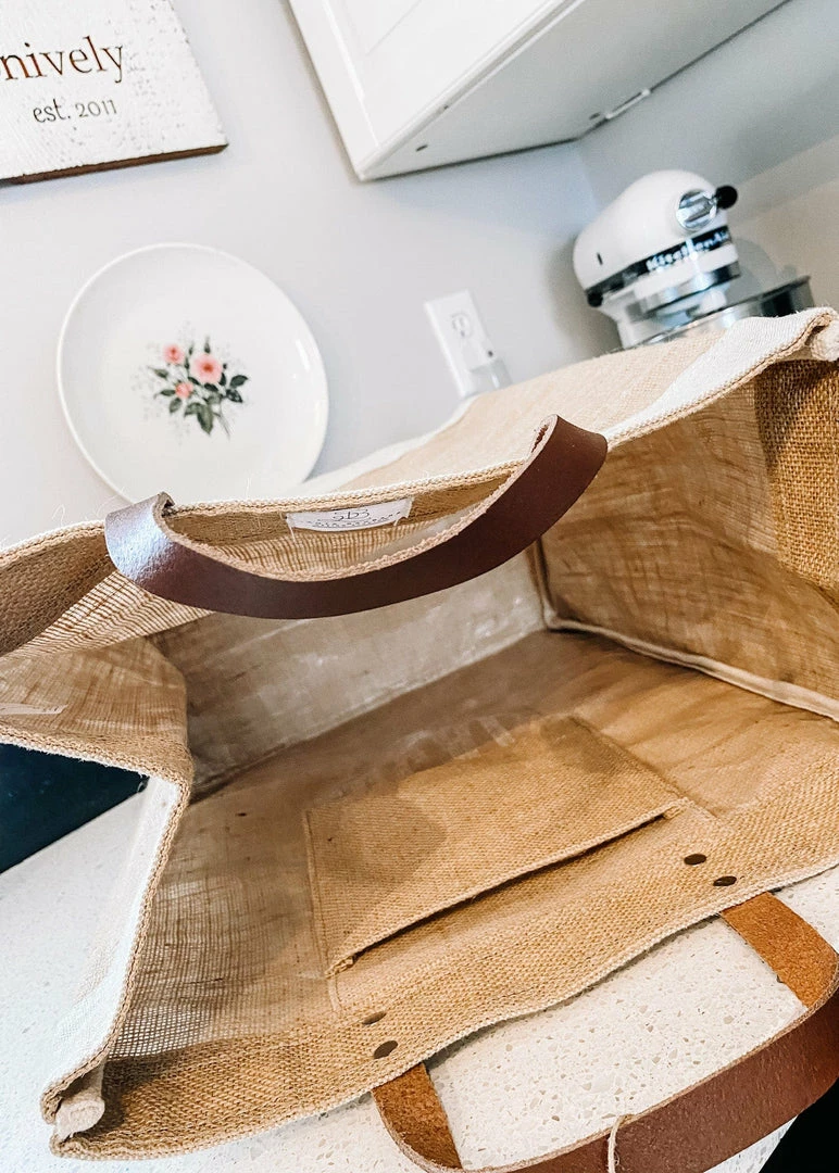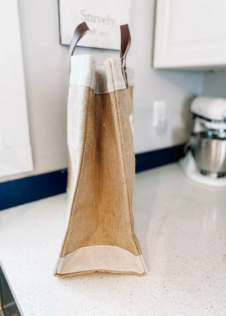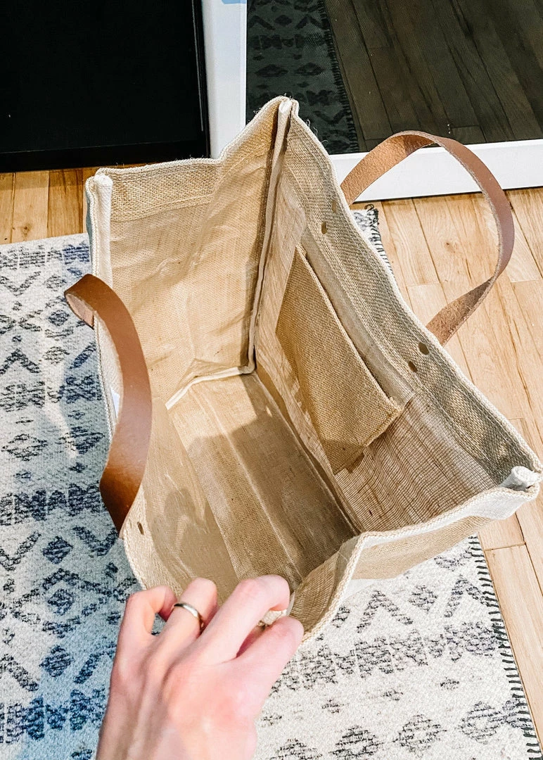 Jute, Waterproof Lining — 13″ W x 18″ H x 8″ D / Inside Pocket: 7″ SQ