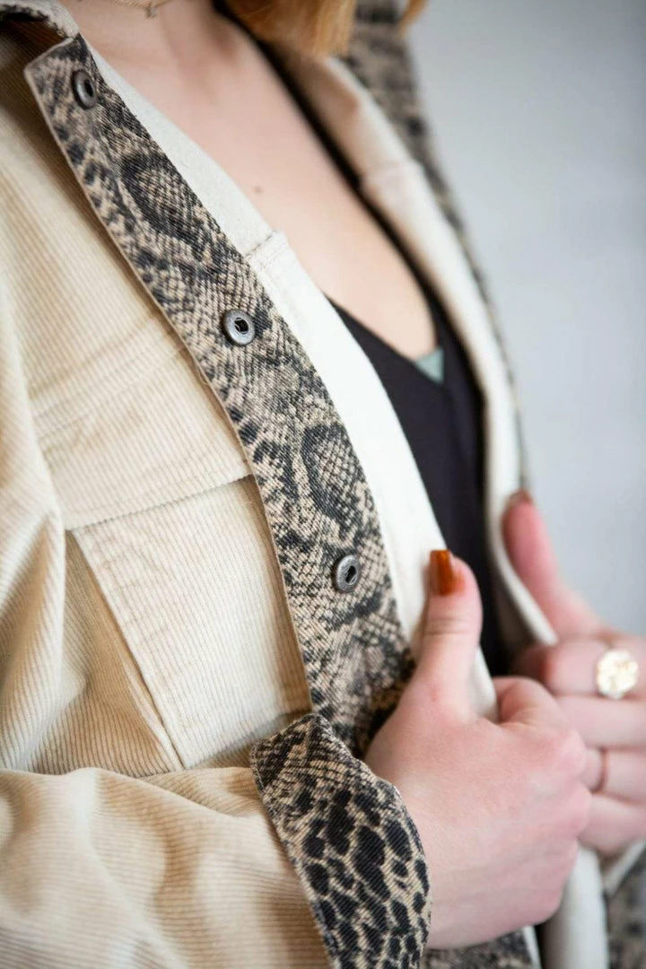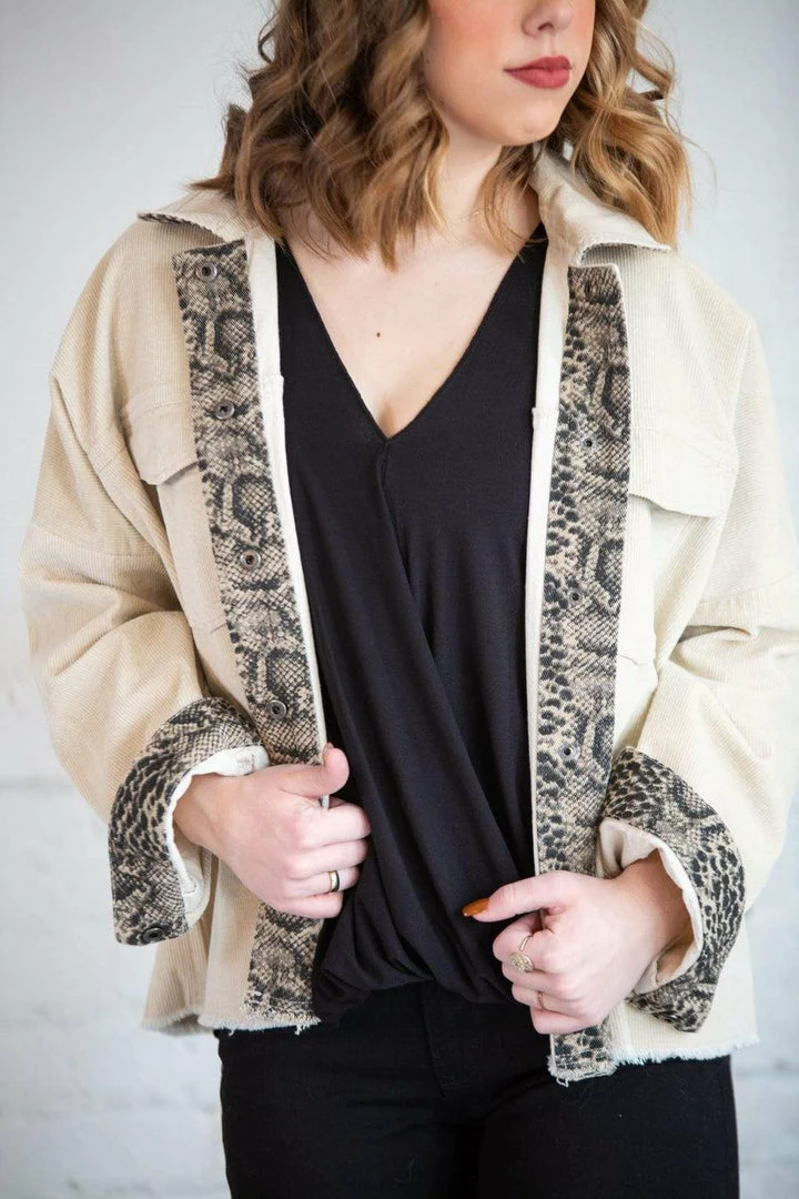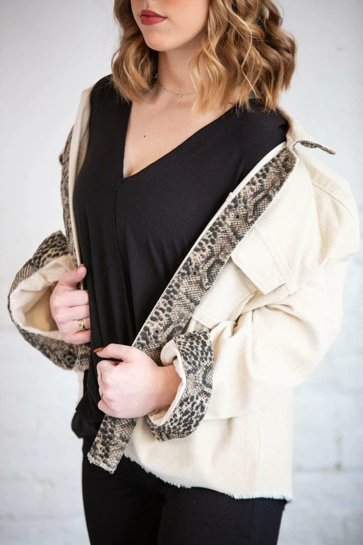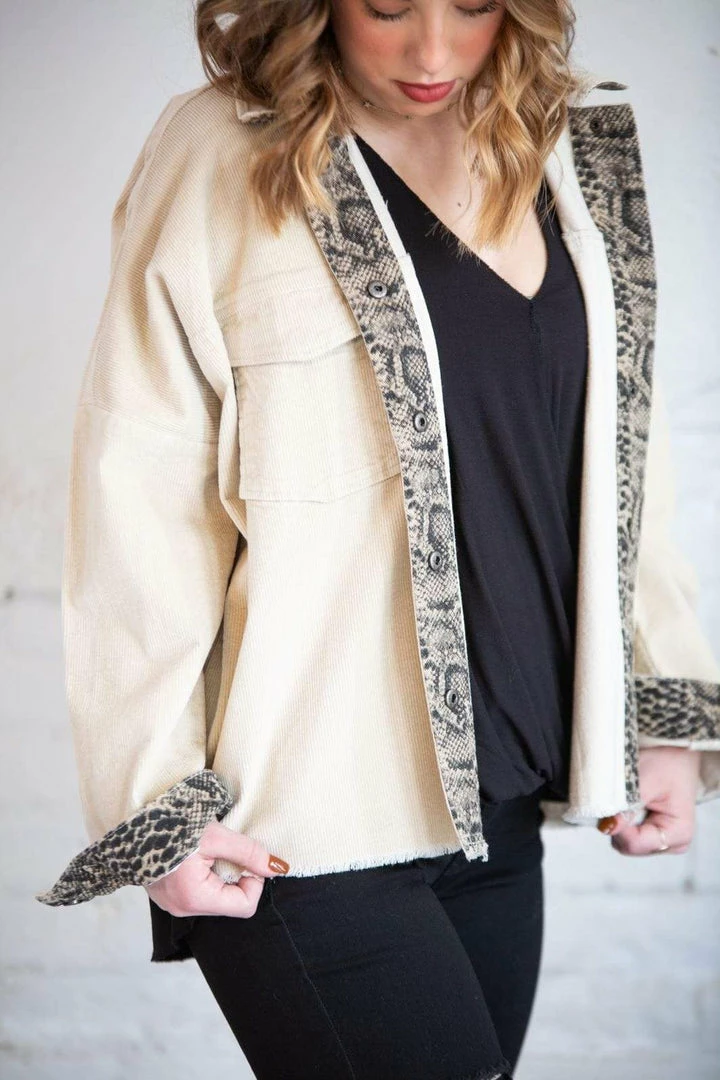 If this jacket could talk, it would say “buy me and wear me forever”. She is a stunning corduroy with an edgy snake skin print accent on the lapels and cuffs. She has a relaxed fit, so she is a size down opportunity and a button down closure in the front. Wear her oversized for a super trendy, yet classic look with a graphic tee and denim!