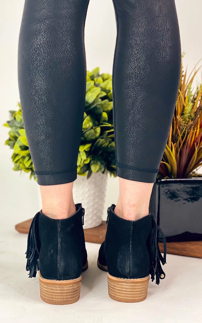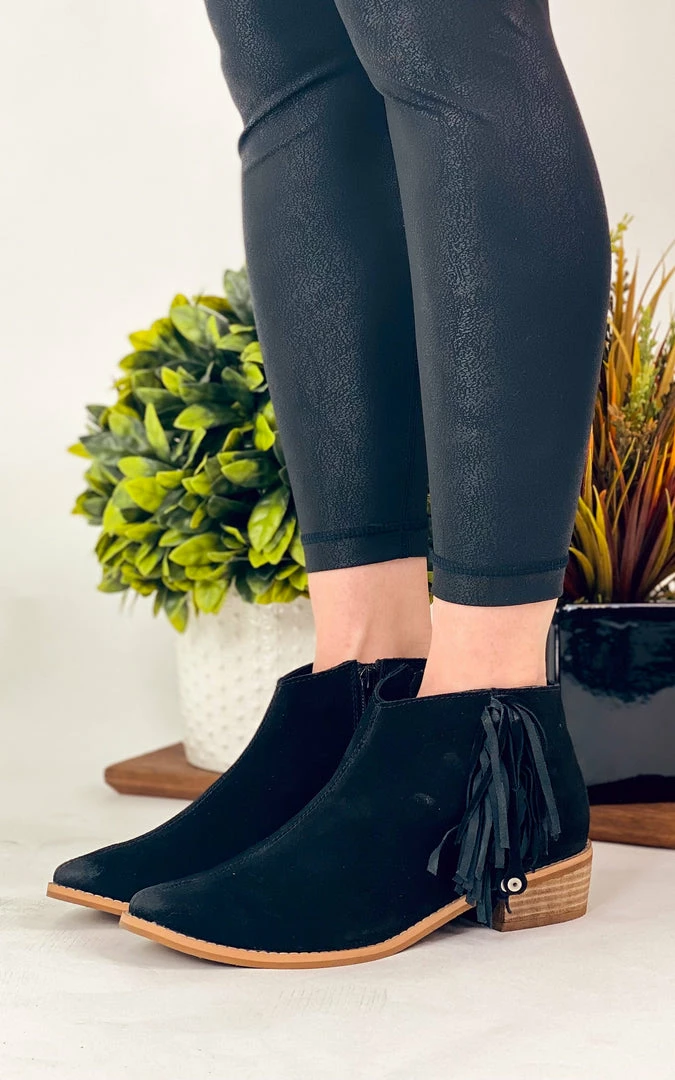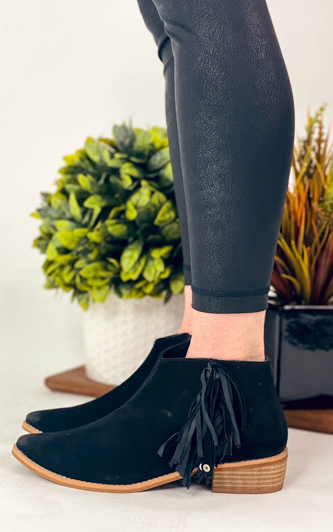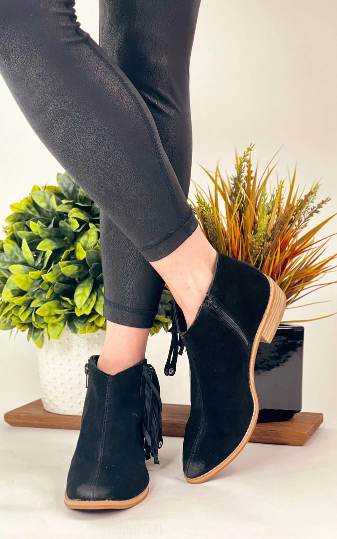 Our iconic Frenchy bootie from last year is back in a new color! It is genuine leather with a padded footbed and inside zipper. The fringe on the outer ankle solidifies the place of this bootie in your wardrobe.