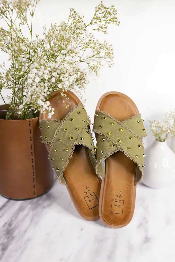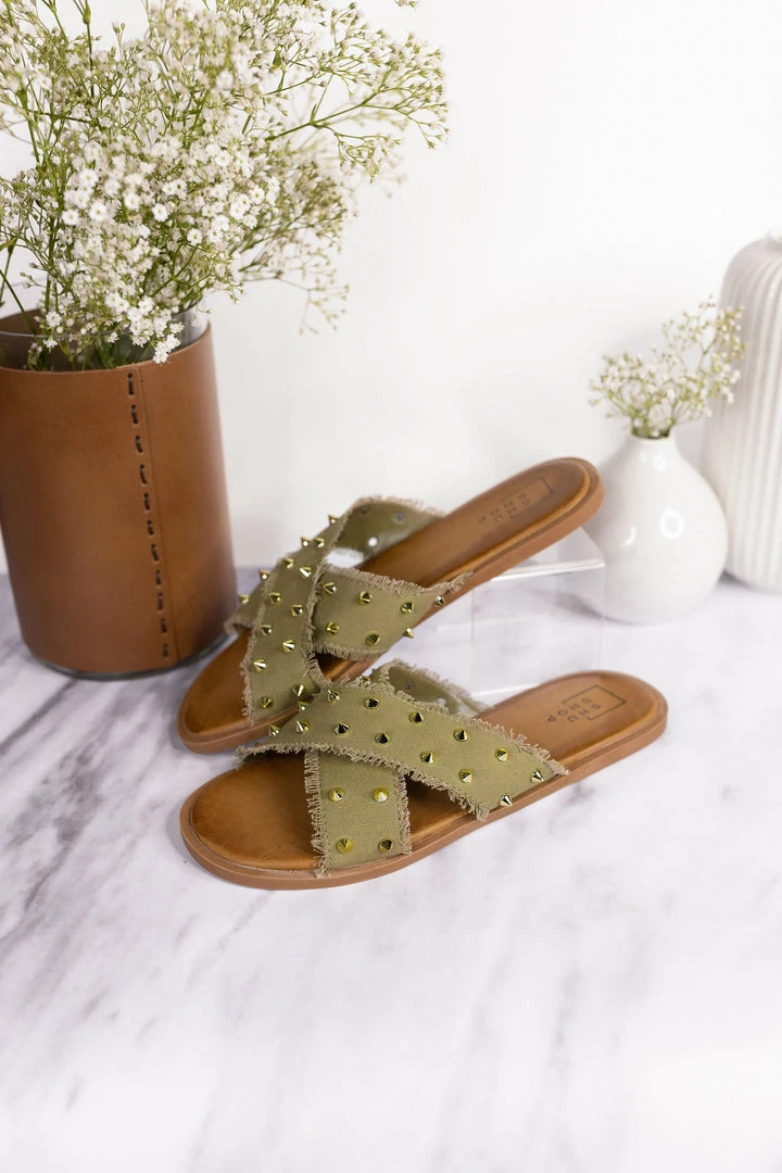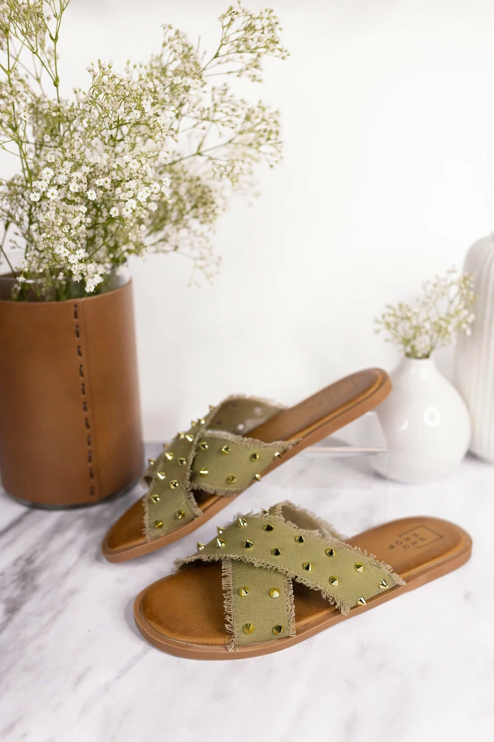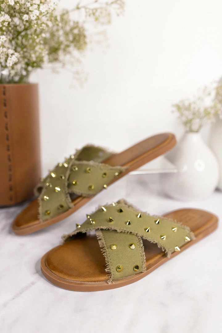 A comfortable sandal with a kick! This causal slide features a soft frayed fabric upper in a x design, topped with golden studs.